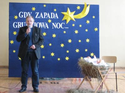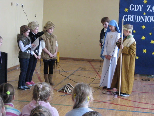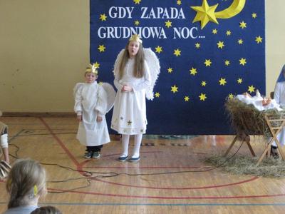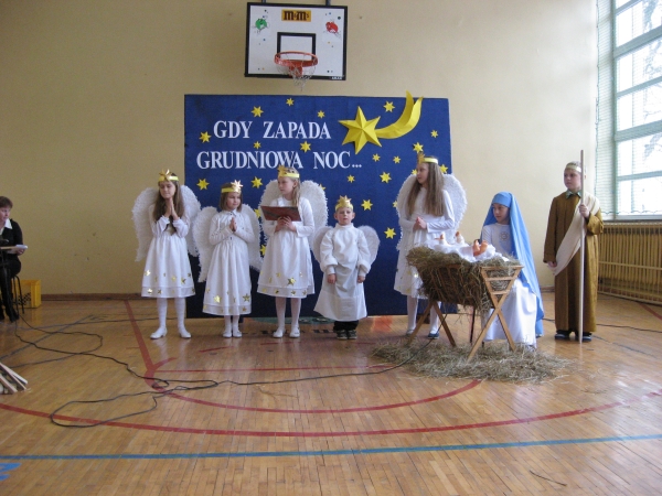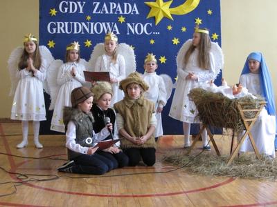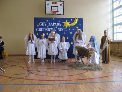 Zbliżający się czas Bożego Narodzenia to czas, w którym nasze myśli biegną ku nowo narodzonemu Chrystusowi. Ten radosny czas w naszej szkole wypełniliśmy Spotkaniem Opłatkowym, które odbyło się 20 grudnia 2012 r. Uczniowie z klas 0, III i IV przybliżyli wszystkim obecnym scenkę szukania przez Maryję i Józefa miejsca na nocleg w drodze do Betlejem, narodzin Zbawiciela, pokłon pastuszków, Trzech Mędrców, a także zwyczaj kolędowania (chodzenia kolędników po domach). Po obejrzeniu inscenizacji p.t. "Gdy zapada grudniowa noc..." nastąpiły niezwykłe chwile dzielenia się chlebem i składania serdecznych życzeń.