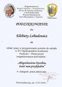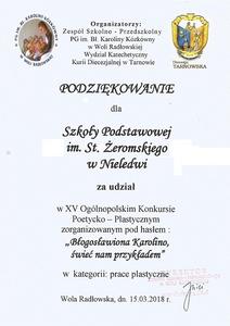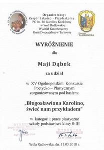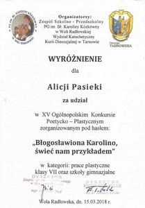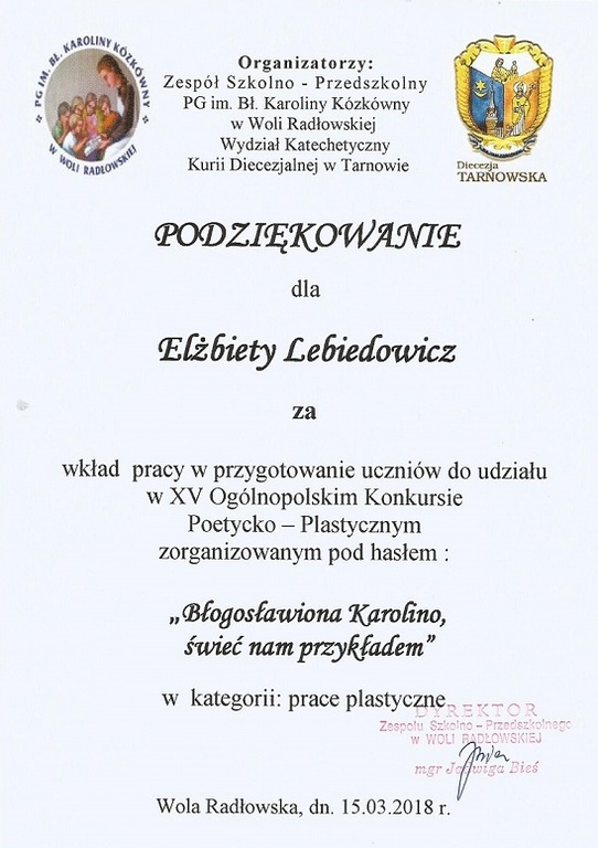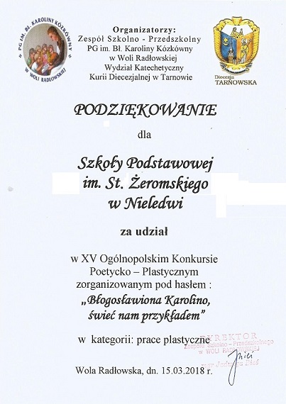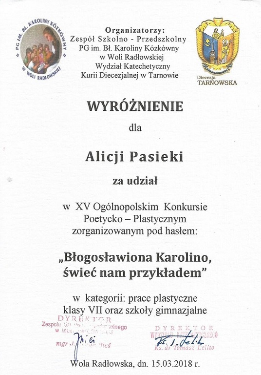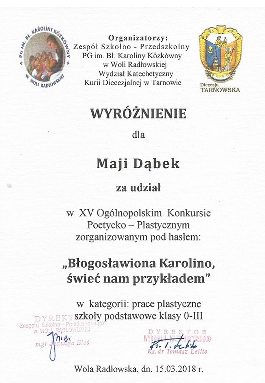 W XV Ogólnopolskim Konkursie Poetycko - Plastycznym zorganizowanym przez Wydział Katechetyczny Kurii Diecezjalnej w Tarnowie, w kategorii: praca plastyczna, uczennice Maja Dąbek i Ala Pasieka zostały wyróżnione i nagrodzone. To kolejny sukces plastyczny Naszych uczniów.