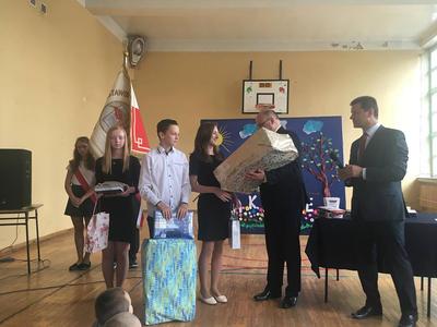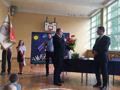 Następnie pan Wójt i pan Dominik Radomski podziękowali wszystkim pracownikom szkoły za ich pracę w mijającym roku szkolnym. Z tej okazji złożyli też kwiaty na ręce Pana Dyrektora.