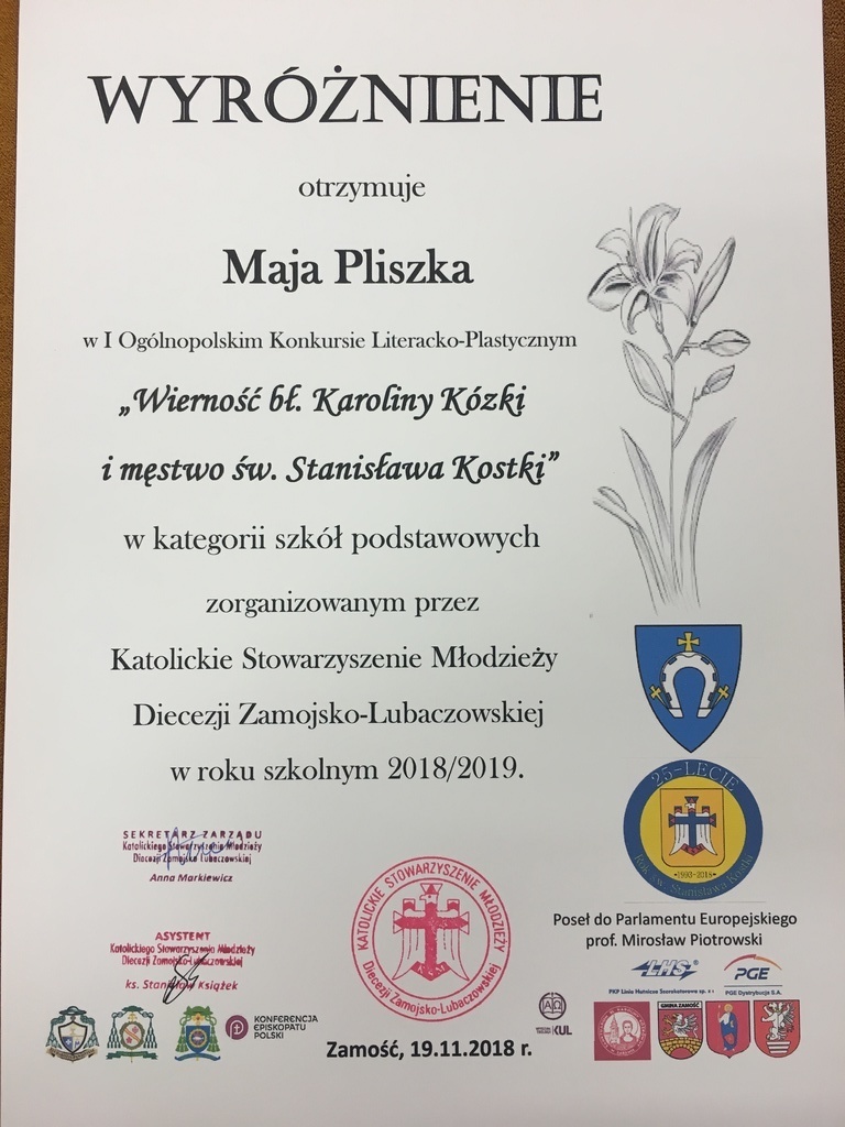 We wrześniu 2018 r. dla klas I - VI został ogłoszony Szkolny Konkurs Plastyczno - Literacki "Wierność bł. Karoliny Kózki i męstwo św. Stanisława Kostki". Na konkurs wpłynęło 15 prac plastycznych. Komisja, oceniając prace za ciekawe pomysły, osobiste przemyślenia, samodzielność oraz zgodność z tematem przyznała wszystkim uczestnikom NAGRODĘ - prace zostały wysłane na I Ogólnopolski Konkurs Plastyczny, zorganizowany przez Katolickie Stowarzyszenie Młodzieży Diecezji Zamojsko - Lubaczowskiej.