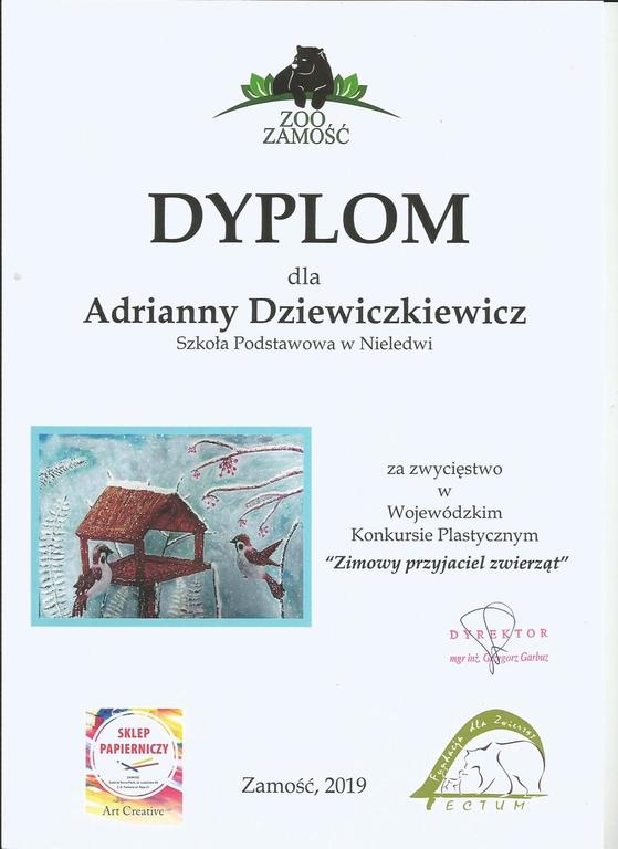 Komisja konkursowa Wojewódzkiego Konkursu Plastycznego pt. " Zimowy Przyjaciel Zwierząt" z pośród 1412 prac plastycznych nagrodziła naszą uczennicę Adę Dziewiczkiewicz nagrodą w kategorii szkół podstawowych IV - VIII. To kolejny pokaz zdolności plastycznych Ady, której gratulujemy i życzymy kolejnych sukcesów. Opiekunem uczennicy jest Pani Wiesława Martyniuk.