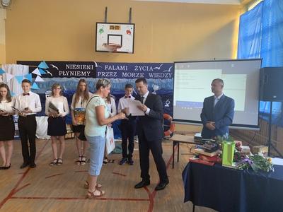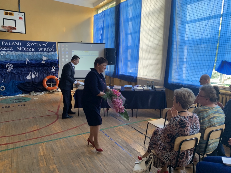 Po mszy św. wszyscy zebrali się na sali gimnastycznej, gdzie nastąpiła dalsza część uroczystości. Na początku głos zabrał dyrektor szkoły pan Andrzej Pachla, która powitał wszystkich zebranych na uroczystości a następnie podsumował miniony rok szkolny, podkreślił twórczą i owocną pracę wszystkich uczniów, szczególnie tegorocznych absolwentów. Podziękował nauczycielom za ich trud, poświęcenie i wysiłek, dzięki któremu uczniowie mogli osiągnąć zadowalające wyniki. Słowa uznania skierowała także do rodziców, których wyjątkowa postawa, poczucie odpowiedzialności za dzieci, przyczyniły się do ich sukcesu.