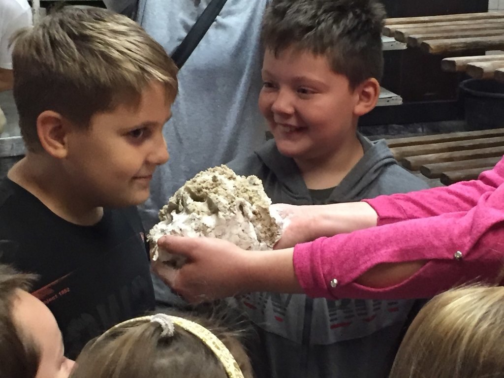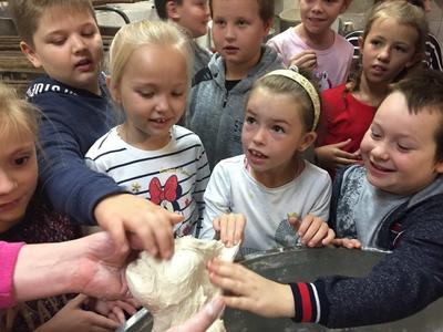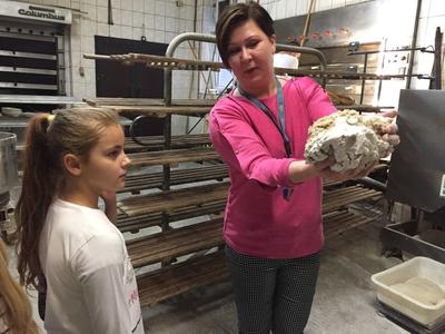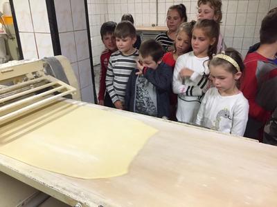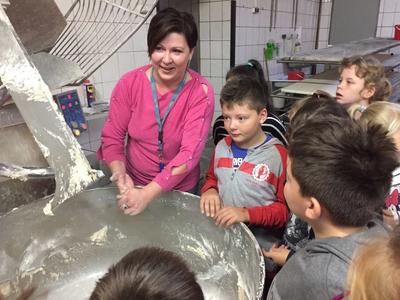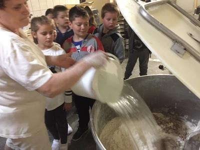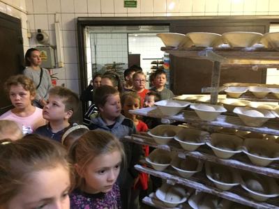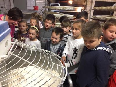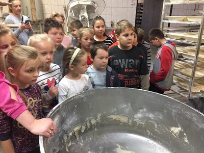 Dnia 23 października uczniowie klasy III wybrali się na wycieczkę do piekarni w Trzeszczanach. Celem wycieczki było poznanie zawodu piekarza, zapoznanie się z etapami wypieku chleba, poznanie produktów do wyrobu pieczywa. Dzieci poznały różne rodzaje pieczywa oraz zobaczyły maszyny, które pomagają w pracy piekarzowi, a pracownicy służyli informacjami na temat wypieku chleba, pokazywali sposoby wałkowania ciasta i zawijania na rurki. Mieliśmy również okazję zwiedzić ogromne magazyny z workami mąki. W piekarni wszystko było ciekawe: ogromne misy na ciasto, wózki z upieczonym chlebem i wielkie łopaty do wysadzania pieczywa. Największe wrażenie wywarł na uczniach ogromny piec, który miał wiele poziomych drzwiczek. Dowiedzieliśmy się w jakiej temperaturze i w jakim czasie pieczony jest chleb. Na koniec uczniowie zostali obdarowani pysznym ciastem. Dzieci wróciły zadowolone, pełne wrażeń. Serdecznie dziękujemy właścicielowi oraz pracownikom piekarni za okazaną gościnność i bardzo miłą atmosferę. W podziękowaniu zostały wręczone drobne upominki, wykonane przez naszych uczniów.