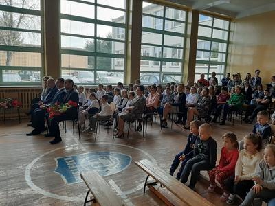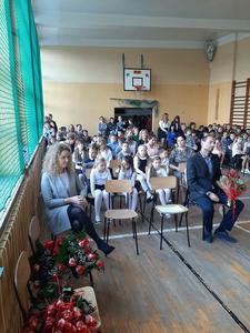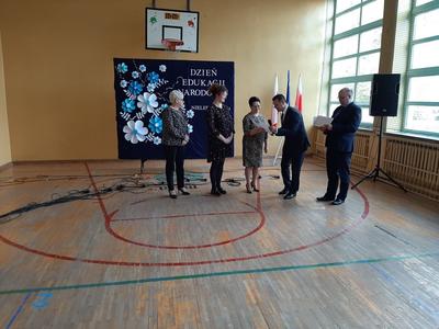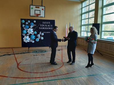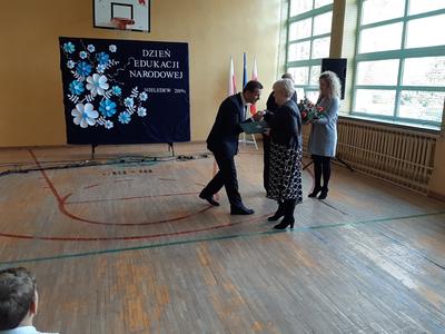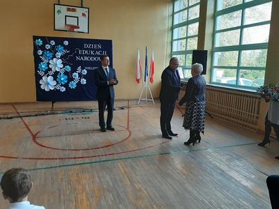Swoją obecnością zaszczycił nas tego dnia Wójt Gminy Trzeszczany, pan Stanisław Czarnota, który złożył na ręce pana Dyrektora wyrazy uznania za trud i pracę, wykonywaną każdego dnia przez wszystkich pracowników szkoły. Pogratulował także wysokich wyników absolwentów z egzaminu ósmoklasisty. Wraz z panią Anną Błaszczuk - Jeleń wręczył nauczycielom i pracownikom oświaty piękne kwiaty w dowód uznania.