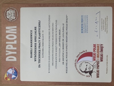 Spośród 627 nadesłanych na konkurs z całej Polski prac, Kamila Markiewicz - ucz. kl. V, zdobyła SPECJALNE WYRÓŻNIENIE za swoja pracę, którą wykonała techniką Quillingu. Otrzymała pamiątkowy dyplom oraz nagrodę rzeczową. Organizatorzy konkursu dziękują a my serdecznie gratulujemy i życzymy dalszych sukcesów.