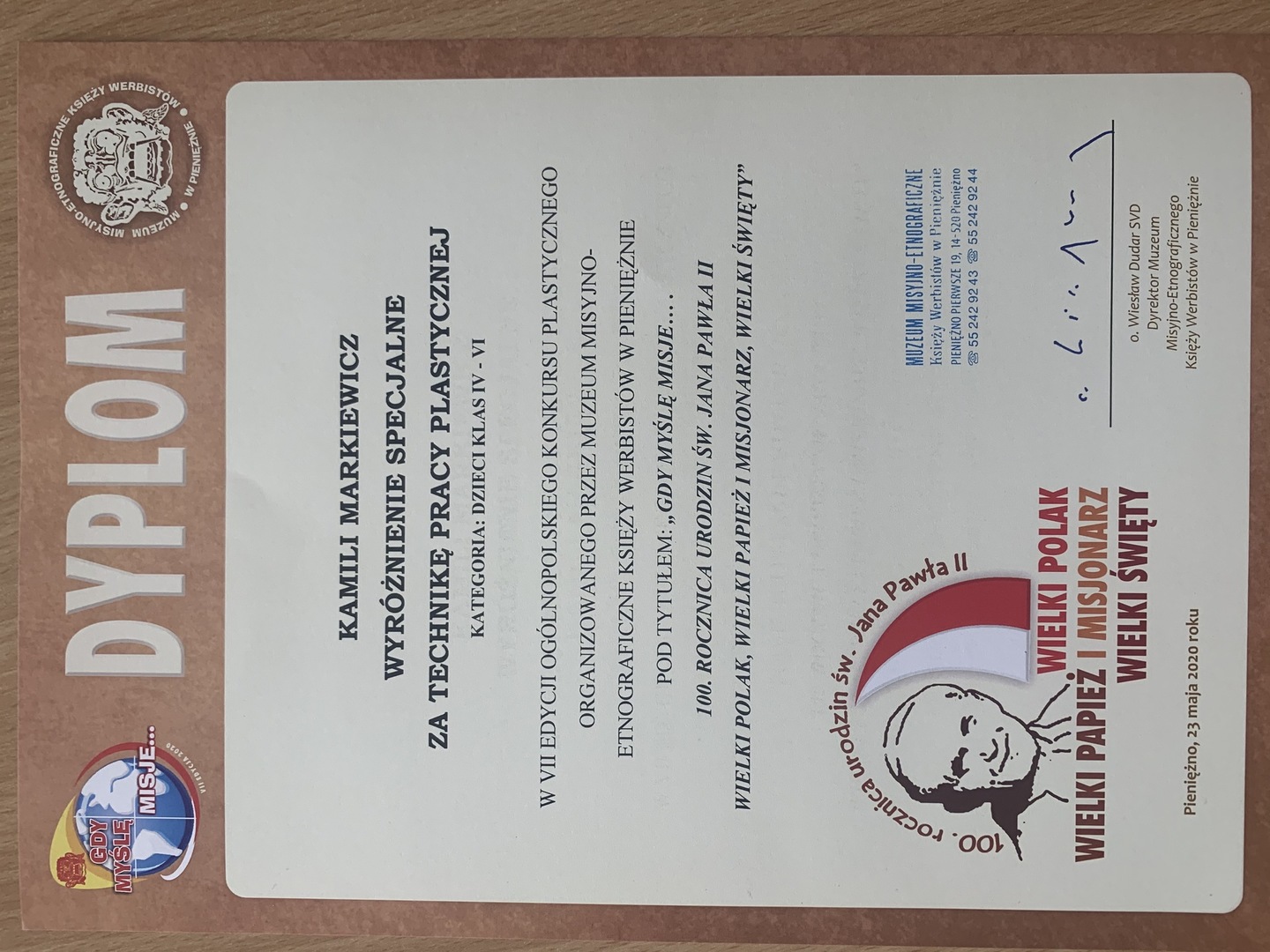 W kwietniu 2020 r. po przypomnieniu postaci, życia, nauczania Wielkiego Polaka, Misjonarza świata... - Św. Jana Pawła II nasi uczniowie z kl. "O" - VI wzięli udział w VII edycji Ogólnopolskiego Konkursu Plastycznego "Gdy myślę misje ... Wielki Polak, Wielki Papież i Misjonarz, Wielki Święty".