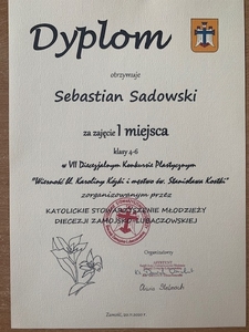 18 listopada bieżącego roku w dzień męczeńskiej śmierci bł. Karoliny organizatorzy konkursu ogłosili wyniki etapu diecezjalnego i? - mamy czym się chwalić - BO: Sebastian Sadowski - ucz. kl. IV - zdobył I MIEJSCE, otrzymał pamiątkowy dyplom oraz nagrodę rzeczową (piękną książkę "O Wielkich Polakach" i grę planszową). Pozostali uczestnicy konkursu także otrzymali pamiątkowe dyplomy. Serdeczne gratulacje dla wszystkich uczniów oraz opiekuna Pani Elżbiety Lebiedowicz, którzy mimo okresu pandemii chętnie wzięli udział w konkursie.