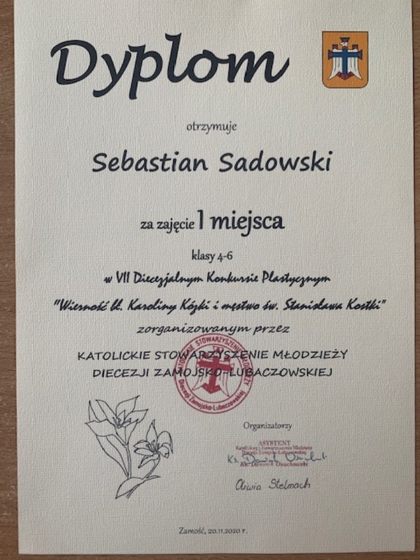 W październiku br. dla uczniów kl. I - V, został ogłoszony szkolny konkurs plastyczny "Wierność bł. Karoliny Kózki i męstwo św. Stanisława Kostki". Celem konkursu było przede wszystkim upowszechnianie wartości, które towarzyszyły bł. Karolinie i św. Stanisławowi. Na w/w konkurs, mimo zawieszonych zajęć w szkole wpłynęło 12 prac plastycznych. Komisja konkursowa po obejrzeniu wszystkich prac wyróżniła 7 z nich: Jagody Kokoć (kl. I), Bartłomieja Hawro (kl. I), Piotra Martyniuka (kl. II), Leny Skrzypczak (kl. II), Doroty Cichackiej (kl. III), Sebastiana Sadowskiego (kl. IV) i Dawida Martyniuka (kl. V). Prace w/w uczniów wzięły udział w VII diecezjalnym konkursie plastycznym "Wierność bł. Karoliny Kózki i męstwo św. Stanisława Kostki", zorganizowanym przez KSM Diecezji zamojsko-lubaczowskiej.