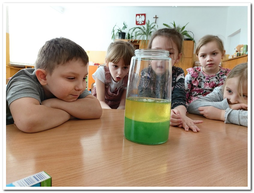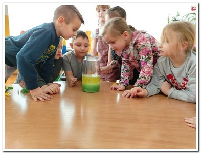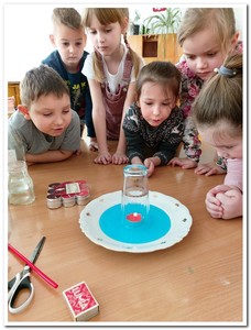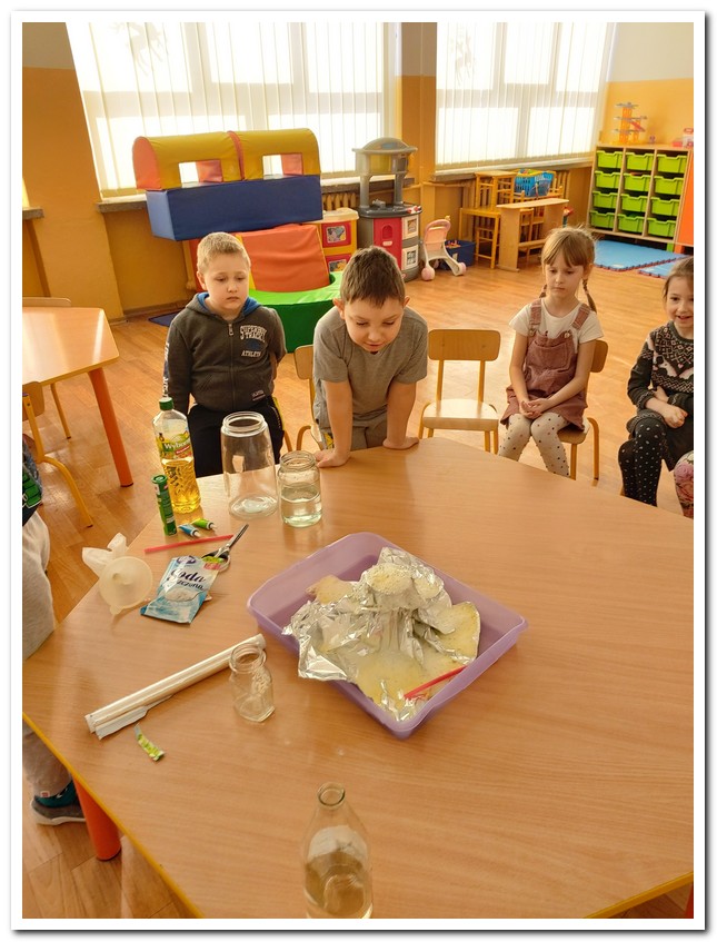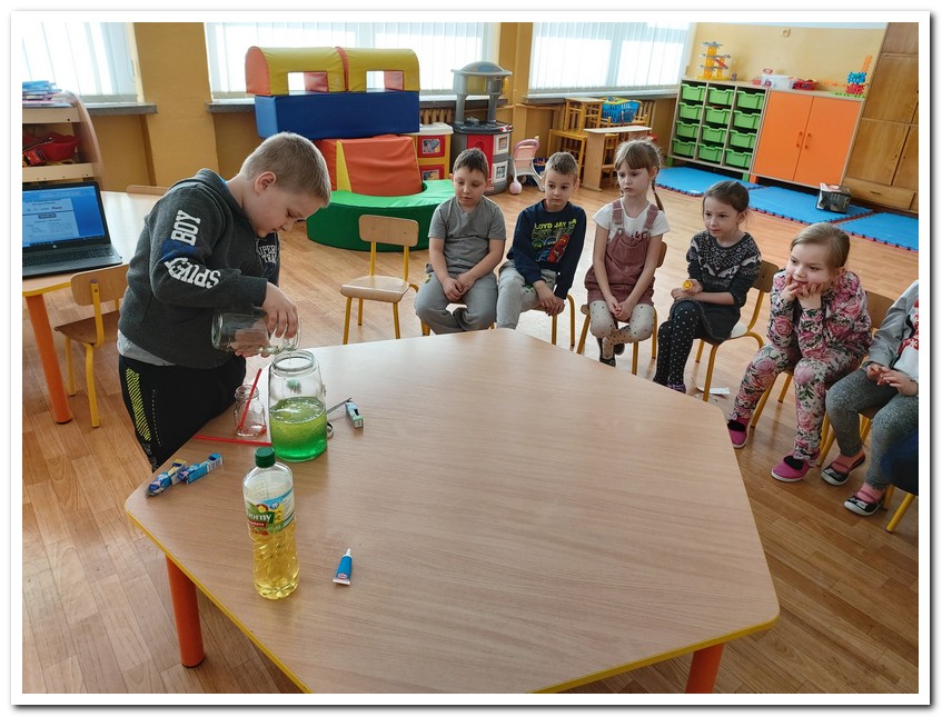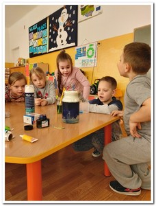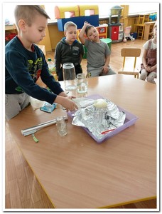 Najbardziej atrakcyjne okazały się zajęcia podczas, których wykonywaliśmy różne eksperymenty, według kategorii: ogień, ziemia, woda, powietrze, na podstawie propozycji podanych przez Misiową Mamę, oraz innych zaproponowanych przez nauczyciela.