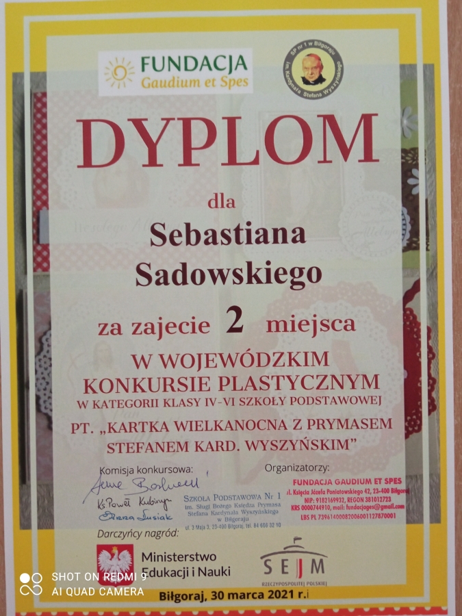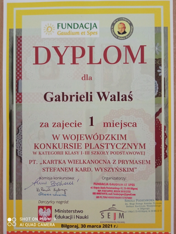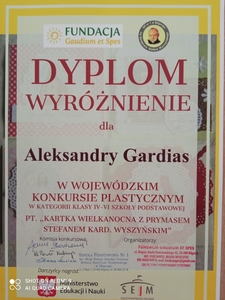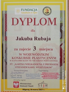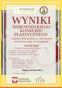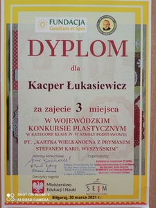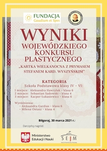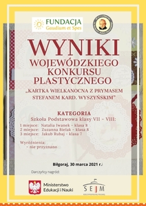 W marcu br. uczniowie naszej szkoły wzięli udział w wojewódzkim konkursie plastycznym na "Kartkę Wielkanocną z Prymasem Stefanem Kardynałem Wyszyńskim" w 120 rocznicę jego urodzin i 40 rocznicę śmierci. Wykonując kartkę uczestnicy musieli zapoznać się z życiem, nauczaniem i działalnością Prymasa Tysiąclecia, by praca była zgodna z ideą konkursu: powinna być związana z życiem, nauczaniem czy działalnością Prymasa Kardynała Stefana Wyszyńskiego oraz być nośnikiem wartości katolickich związanych ze Świętami Zmartwychwstania Pańskiego. Na konkurs wpłynęło 70 prac uczniów szkół podstawowych z terenu województwa lubelskiego i diecezji zamojsko-lubaczowskiej. Z naszej szkoły, pomimo trwającej pandemii i nauczania zdalnego wysłanych zostało aż 27 prac. I po raz kolejny mamy czym się pochwalić: w kategorii kl. I - III: Gabriela Walaś zdobyła I miejsce, Piotr Martyniuk - wyróżnienie; w kategorii kl. IV - VI: Sebastian Sadowski - II miejsce, Kacper Łukasiewicz - III miejsce, a Aleksandra Gardias - wyróżnienie; w kategorii kl. VII - VIII: Jakub Rubaj - III miejsce; Laureaci konkursu otrzymali nagrody rzeczowe ufundowane przez Ministra Edukacji i Nauki oraz Marszałka Sejmu RP. Organizatorzy konkursu składają podziękowanie wszystkim uczestnikom, nauczycielom, opiekunom oraz rodzicom, a laureatom gratulują nagród i wyróżnień.