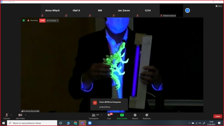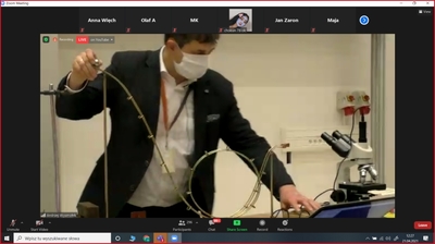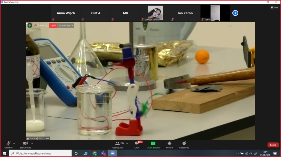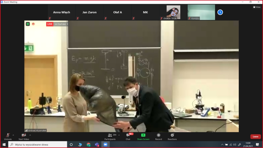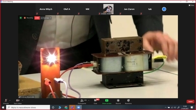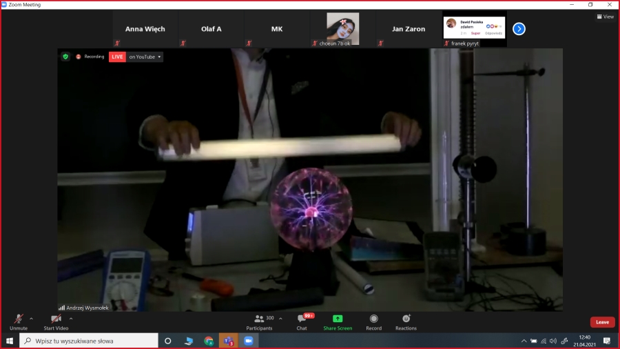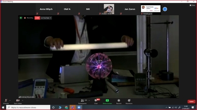 W dniu 21 kwietnia 2021 roku uczniowie klasy VII i VIII brali udział w wykładzie on-line zorganizowanym przez Wydział Fizyki Uniwersytetu Warszawskiego. Prof. dr hab. Andrzej Wysmołek wprowadził młodzież w świat „Energii i jej przemian”, zaprezentował doświadczenia, które łączą w sobie różne działy fizyki. Pan Profesor wyjaśnił uczniom skąd bierze się energia, jakie są jej rodzaje, w jaki sposób następuje zamiana jednego rodzaju w drugi czy też przybliżył zasadę zachowania energii. Uczniowie wiedzą już jak wygląda transformator, prądnica, spirala śmierci, kula plazmowa. Po obejrzeniu doświadczeń z ciekłym azotem i balonem potrafią odpowiedzieć na pytanie „czy energia znika”? czy też można ją wykorzystać w inny sposób – np. budując elektrownie wodne.