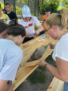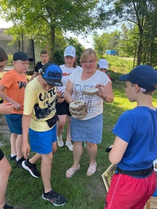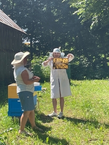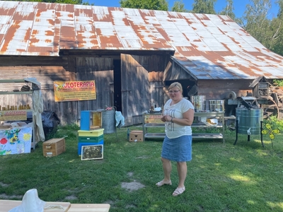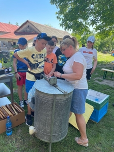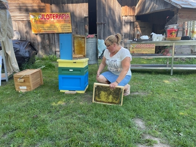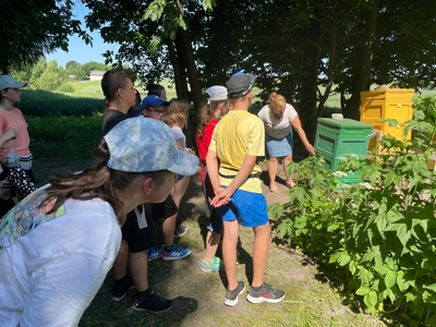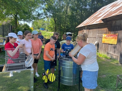 W czasie pobytu w pasiece uczestnicy wysłuchali ciekawej pogadanki na temat życia, budowy i zwyczajów pszczół, dowiedzieli się również na czym polega praca pszczelarza i jaką rolę odgrywają szczoły w przyrodzie. Mięli okazję obejrzeć ule i poznać ich budowę. Pani Bieńko zaprezentowała sprzęt, dzięki któremu pozyskuje miód, ale również inne niezbędne przedmioty, wykorzystywane w pasiece.
