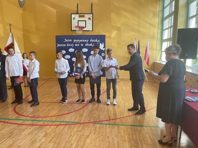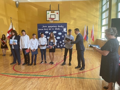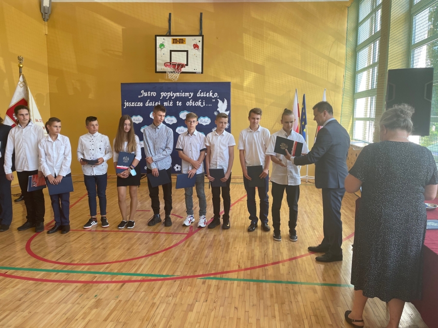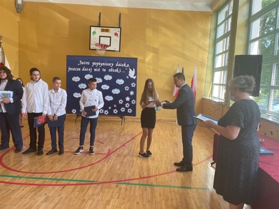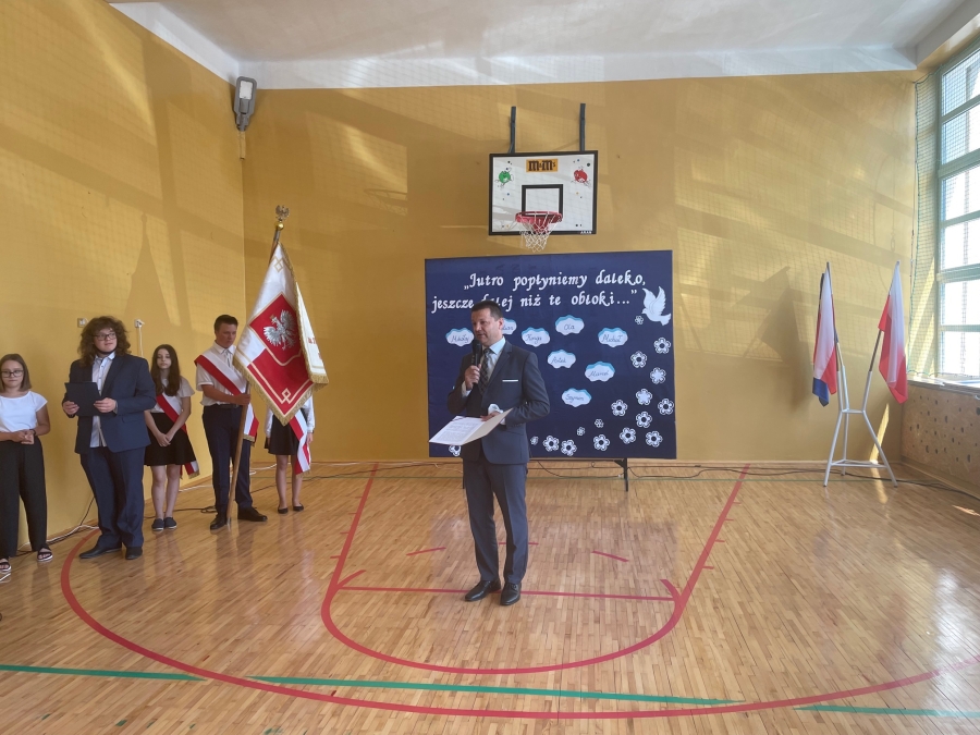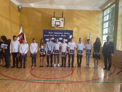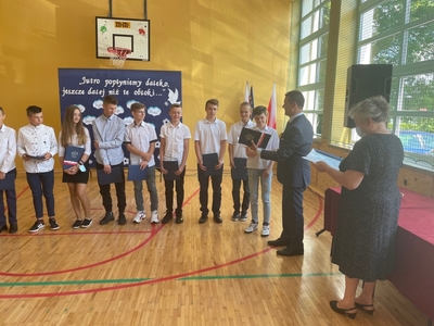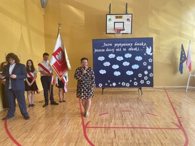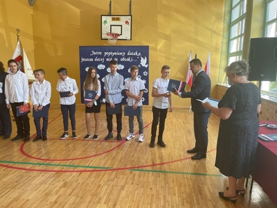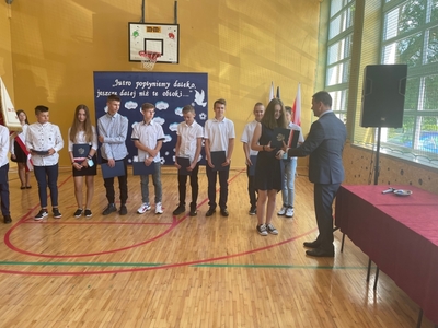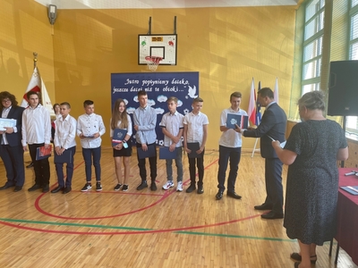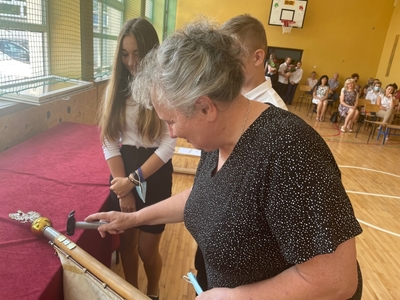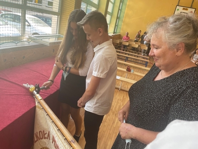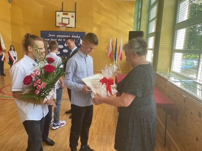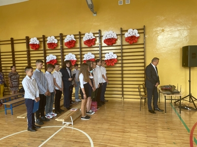 Naszych absolwentów pożegnał pan Dyrektor Andrzej Pachla, Wychowawczyni klasy, pani Feliksa Perehubka oraz zgromadzeni nauczyciele, rodzice i pracownicy szkoły. Ósmoklasiści otrzymali nagrody za wysokie wyniki w nauce oraz zaangażowanie w konkursach oraz świadectwa ukończenia szkoły podstawowej. Na koniec uczniowie klasy VIII, na pamiątkę, wbili symboliczny gwóźdź w drzewiec sztandaru szkoły.