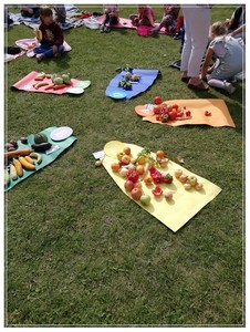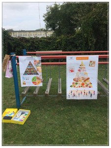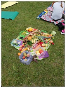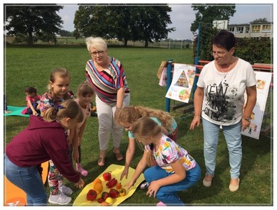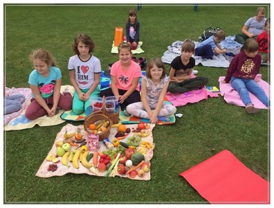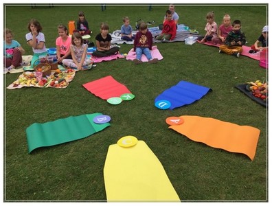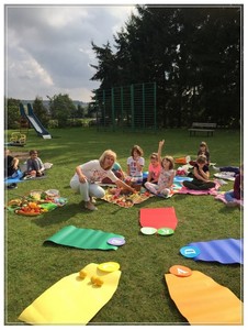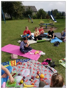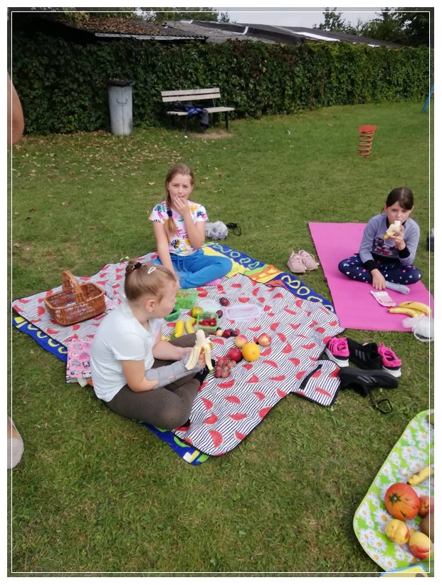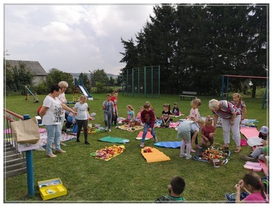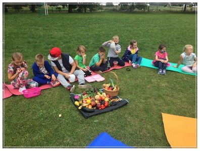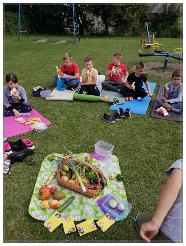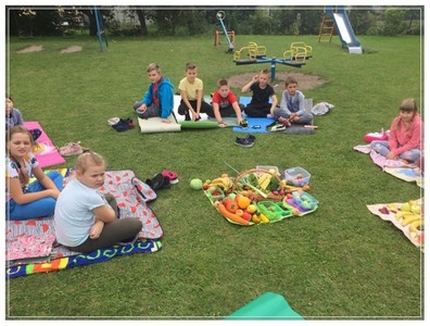 Podczas pikniku omówiono piramidę żywienia wskazując grupy produktów najbardziej wartościowych dla zdrowia. Uczniowie wspólnie ustalili, że należy spożywać więcej produktów pochodzenia roślinnego niż zwierzęcego. Poznali jakie witaminy zawierają owoce i warzywa. Opowiadali o sposobach wykorzystania i przetwarzania owoców i warzyw np.: dżemy, konfitury, soki, sałatki, zupy. Każda klasa układała przyniesione przez siebie owoce i warzywa na kole witamin. Wszyscy uczniowie zaśpiewali piosenkę pt,, Witaminki, witaminki dla chłopczyka i dziewczynki’. Każdy uczeń częstował się i jadł ulubiony owoc lub warzywo.