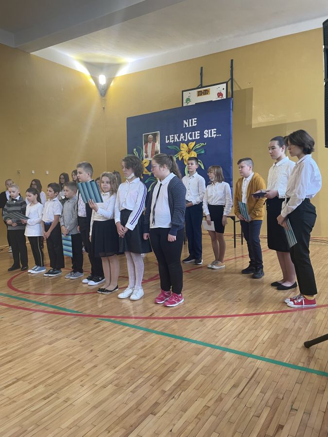 Każdego roku w październiku w całej Polsce obchodzony jest Dzień Papieski. Tak, jak Św. Jan Paweł II gromadził Polaków na całym świecie, tak dziś w naszej szkole zgromadziła się cała Społeczność Uczniowska, Grono Pedagogiczne, Pan Dyrektor, Ks. Proboszcz i pracownicy szkoły, by przypomnieć osobę, nauczanie i dorobek Wielkiego Rodaka – Papieża Polaka, dzisiaj już Sługę Bożego Św. Jana Pawła II.