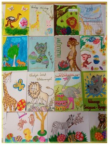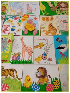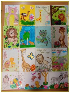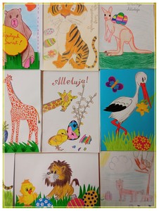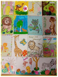 By poszerzać i popularyzować wiedzę o zwyczajach i tradycjach wielkanocnych uczniowie z oddziału przedszkolnego oraz z klasy I, II, V, VI i VII pod kierunkiem p. M. Fedorczuk i p. E. Lebiedowicz wzięli udział w Wojewódzkim Konkursie Plastycznym „Wielkanocna Kartka ze zwierzęciem w zamojskim zoo”.