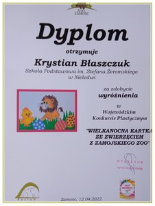 11 kwietnia br. komisja konkursowa wyłoniła zwycięzców i przyznała nagrody. Na liscie laureatów znalazł się KRYSTIAN BŁASZCZUK – ucz. kl. VII, który za swoja pracę otrzymał WYRÓŻNIENIE w formie pamiątkowego dyplomu i nagrody rzeczowej. Pozostali uczestnicy konkursu otrzymali pamiątkowe dyplomy.