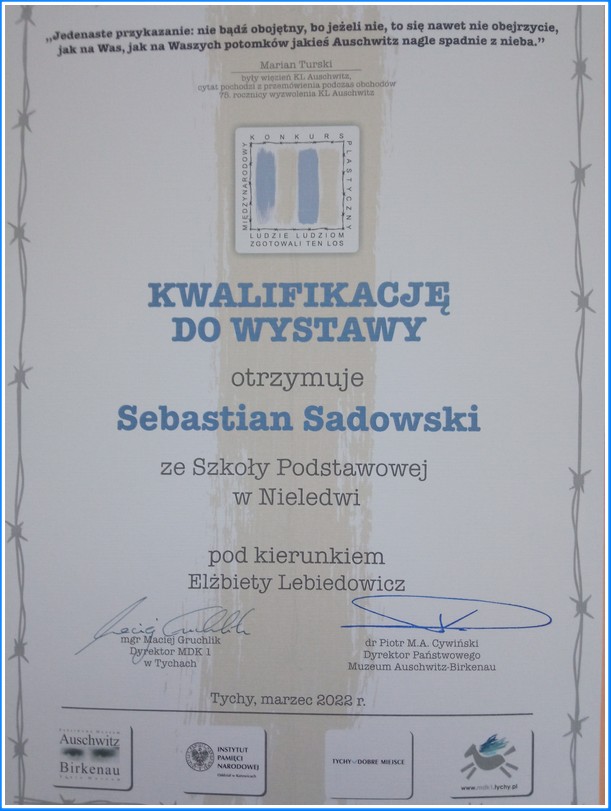 W lutym br. uczniowie z kl. V pod kierunkiem p. E. Lebiedowicz przystąpili do XXIV Międzynarodowego Konkursu Plastycznego „Ludzie, ludziom zgotowali ten los”. Komisja konkursowa przyznała 17 nagród w tym jedną nagrodę specjalną, 24 wyróżnień i aż 53 prace zakwalifikowała do wystawy w Międzynarodowym Centrum Edukacji w Auschwitz i Holokauście w Oświęcimiu znajdującym się na terenie Państwowego Muzeum Auschwitz-Birkenau. Praca SEBASTIANA SADOWSKIEGO została wybrana na wystawę tegorocznego konkursu, który był wyjątkowy, a także jest umieszczona w pięknym albumie wśród nagrodzonych i wyróżnionych prac, który otrzymał jako nagrodę.