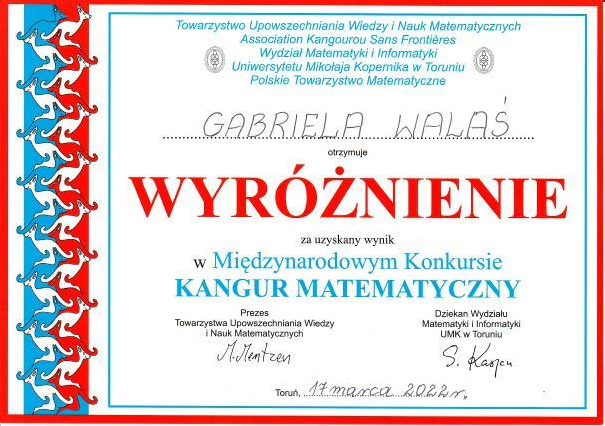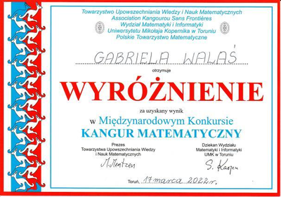 Gabrysia Walaś wyróżniona !!! W przeprawadzonym w marcu 2022 r. Międzynarodowym Konkursie Matematycznym Kangur, uczennica klasy czwartej Gabrysia Walaś zdobyła wyróżnienie. Serdecznie gratulujemy i życzymy dalszych sukcesów !!! Galeria zdjęć Powiązane wiadomości Wiwat Maj! Trzeci Maj! GRATULACJE dla SEBASTIANA !!! Konkursy wielkanocne z udziałem naszych uczniów Gabrysia Walaś wyróżniona !!! Egzamin ósmoklasisty 2022 Kamila Markiewicz wyróżniona ! Drukuj Udostępnij Data dodania: 19.05.2022 Wyświetlono: 155 Aktualności