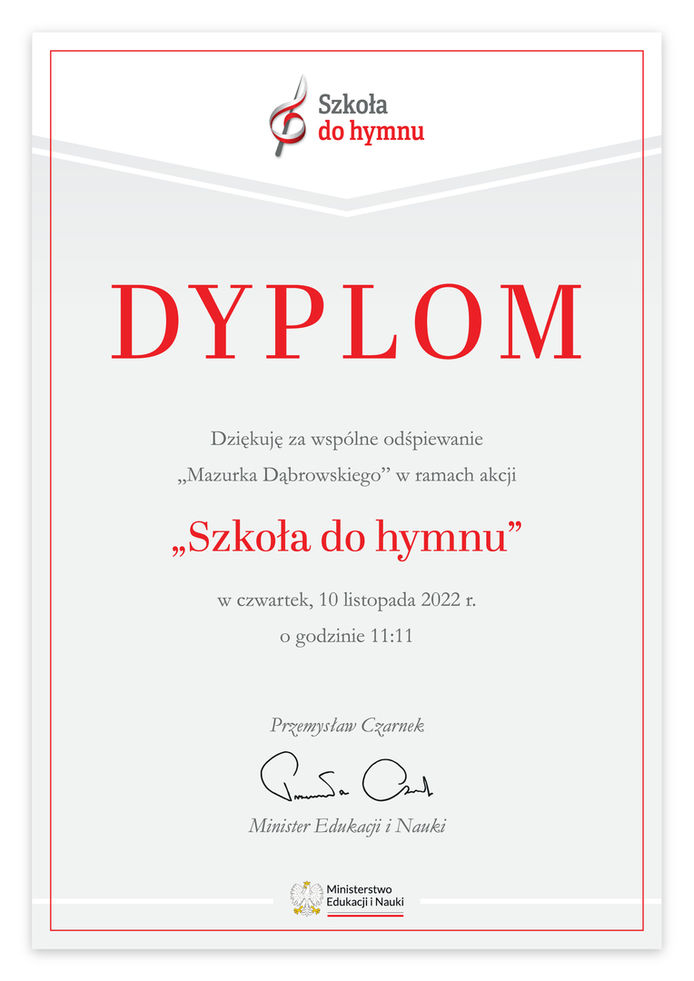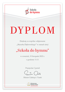 Już po raz piąty cała Nasza społeczność szkolna wzięła udział w akcji "Szkoła do hymnu". W ostatni dzień roboczy przed Narodowym Świętem Niepodległości o symbolicznej godzinie 11:11 zaśpiewaliśmy „Mazurka Dąbrowskiego”. W ten sposób włączyliśmy się we wspólne świętowanie kolejnej rocznicy odzyskania przez Polskę niepodległości.