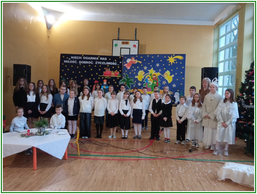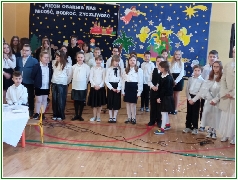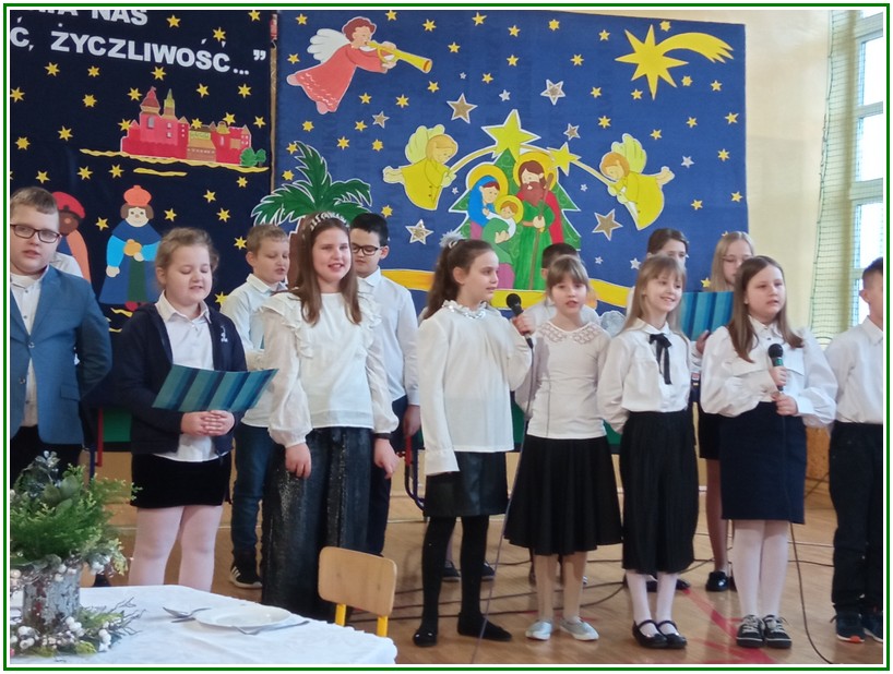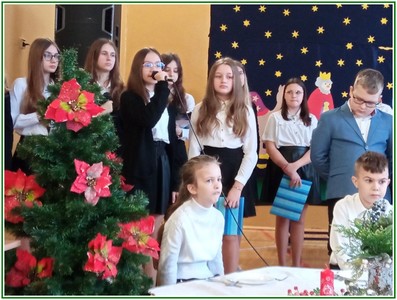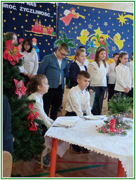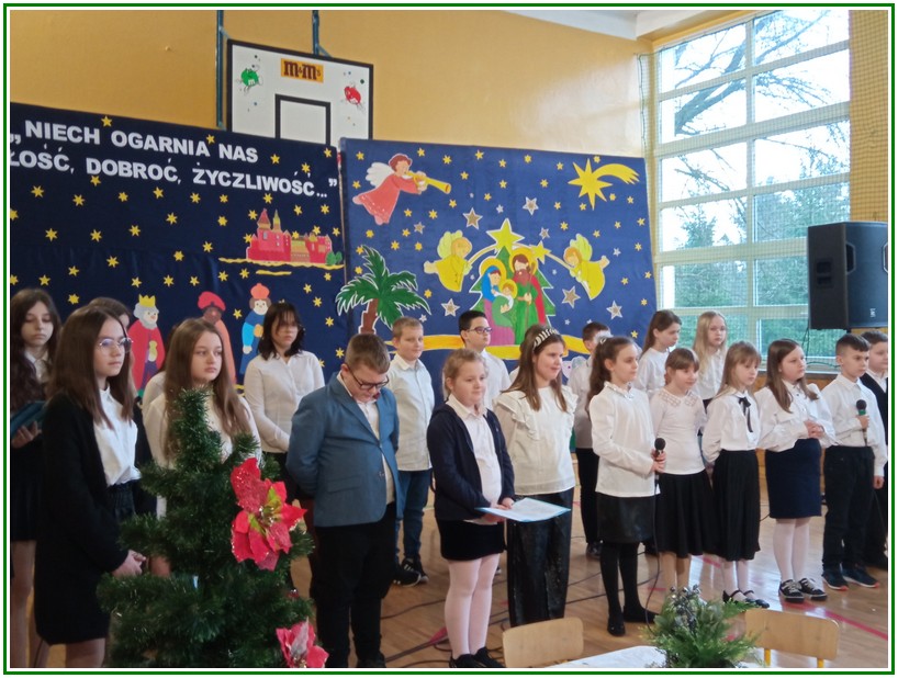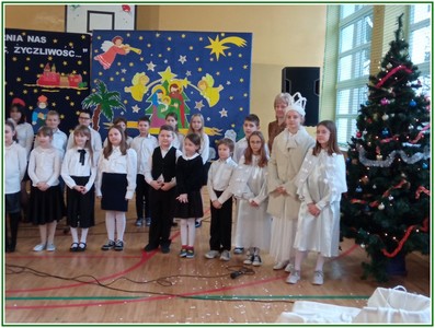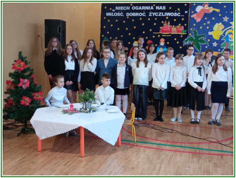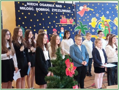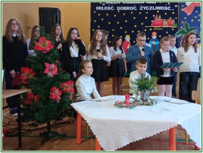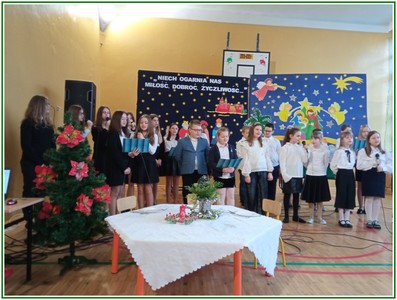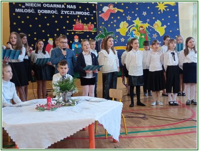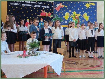 Początek stycznia to wyjątkowy czas kolędowania, składania noworocznych życzeń… W naszej szkole po dwuletniej przerwie związanej z pandemią i nauczaniem zdalnym uczniowie kl. II – VIII pod kierunkiem pań: Elżbiety Lebiedowicz i Ewy Stepaniuk przygotowali inscenizację pt. „Niech ogarnia nas miłość, dobroć, życzliwość…”, w której przypomnieli polskie tradycje związane ze Świętami Bożego Narodzenia, złożyli całej Społeczności Uczniowskiej oraz wszystkim pracownikom szkoły i obecnym na spotkaniu rodzicom piękne noworoczne życzenia. Nie zabrakło też śpiewu pięknych kolęd. Uczniowie swym pięknym występem podbili serca publiczności. Niejednej osobie zakręciła się łza w oku.... Kiedy część artystyczna dobiegła końca, występujący uczniowie otrzymali gromkie brawa. Występ był niezwykłym przeżyciem zarówno dla uczniów, rodziców jak i nauczycieli. Dostarczył wszystkim niezapomnianych wrażeń. Na koniec p. dyrektor podziękował i wyraził wiele ciepłych słów aktorom za piękną i bogatą w treść inscenizację, paniom za wymowną dekorację, oraz złożył wszystkim obecnym na Spotkaniu Noworocznym życzenia.