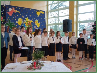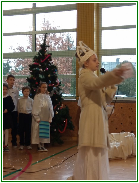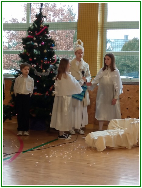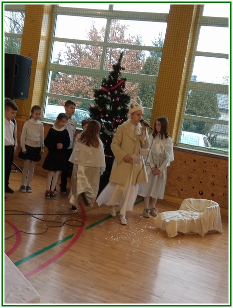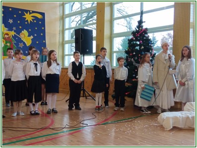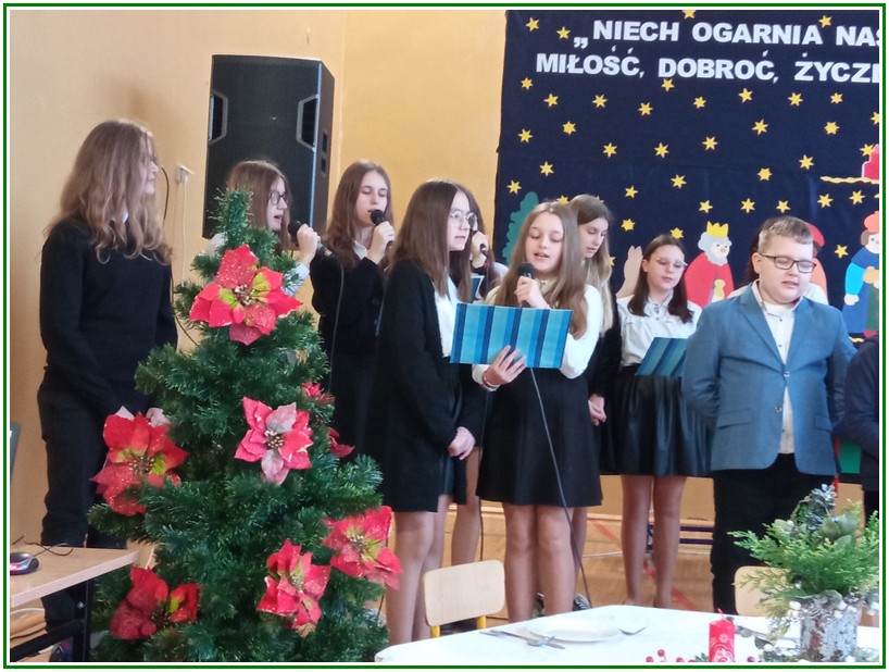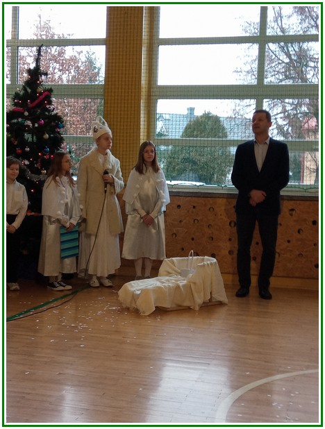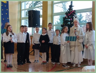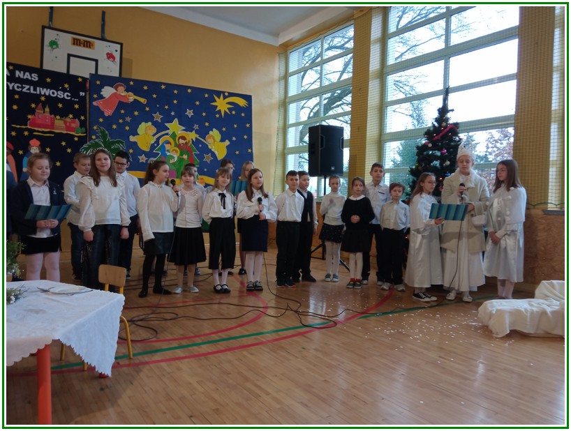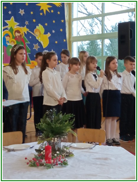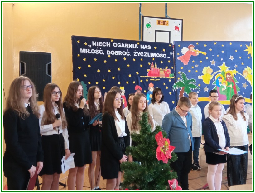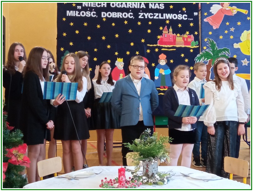 Początek stycznia to wyjątkowy czas kolędowania, składania noworocznych życzeń… W naszej szkole po dwuletniej przerwie związanej z pandemią i nauczaniem zdalnym uczniowie kl. II – VIII pod kierunkiem pań: Elżbiety Lebiedowicz i Ewy Stepaniuk przygotowali inscenizację pt. „Niech ogarnia nas miłość, dobroć, życzliwość…”, w której przypomnieli polskie tradycje związane ze Świętami Bożego Narodzenia, złożyli całej Społeczności Uczniowskiej oraz wszystkim pracownikom szkoły i obecnym na spotkaniu rodzicom piękne noworoczne życzenia. Nie zabrakło też śpiewu pięknych kolęd. Uczniowie swym pięknym występem podbili serca publiczności. Niejednej osobie zakręciła się łza w oku.... Kiedy część artystyczna dobiegła końca, występujący uczniowie otrzymali gromkie brawa. Występ był niezwykłym przeżyciem zarówno dla uczniów, rodziców jak i nauczycieli. Dostarczył wszystkim niezapomnianych wrażeń. Na koniec p. dyrektor podziękował i wyraził wiele ciepłych słów aktorom za piękną i bogatą w treść inscenizację, paniom za wymowną dekorację, oraz złożył wszystkim obecnym na Spotkaniu Noworocznym życzenia.