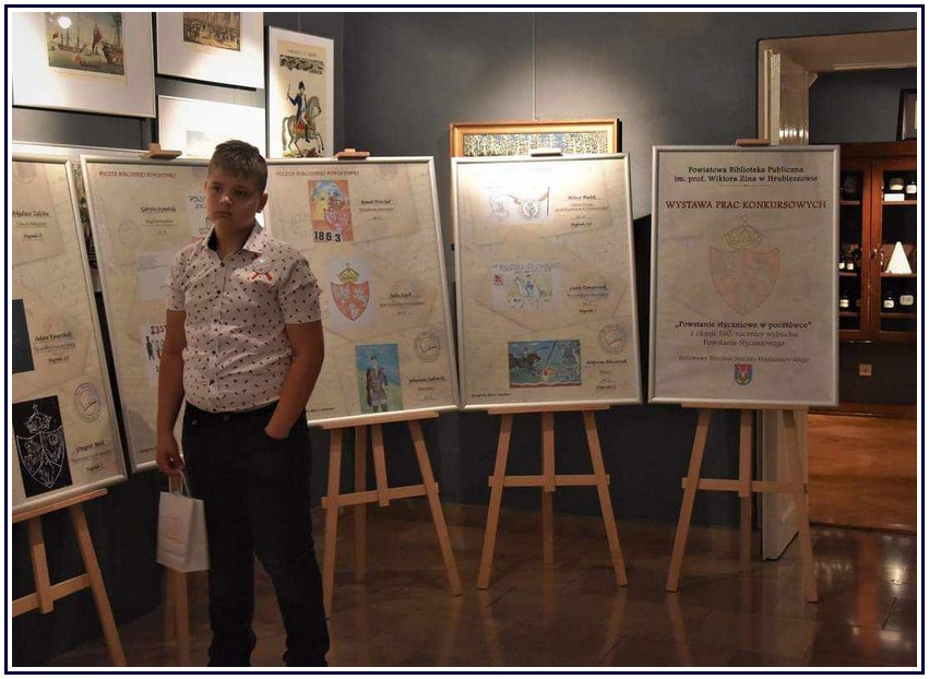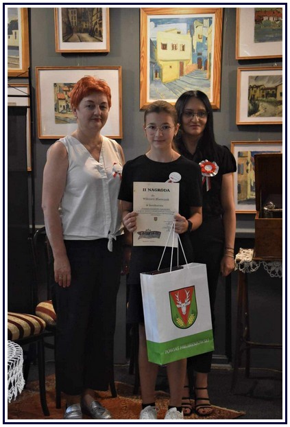 Troje uczniów naszej szkoły: Wiktoria Błaszczuk kl. VI, Julia Szych kl. VII i Sebastian Sadowski kl. VII wzięło udział w powiatowym konkursie plastycznym, którego tematyką było powstanie styczniowe. Organizatorem konkursu była Powiatowa Biblioteka Publiczna im. prof. Wiktora Zina w Hrubieszowie. Uczniowie Ci wraz z zaproszonym rodzicami i opiekunem plastycznym (p. Wiesławą Martyniuk) dnia 9 września 2023 r. (sobota) uczestniczyli w uroczystym wręczeniu nagród, które odbyło się w Muzeum w Hrubieszowie podczas Narodowego Czytania. Uczennica kl. VI Wiktoria Błaszczuk zajęła II miejsce i otrzymała nagrodę oraz dyplom. Julka i Sebastian otrzymali nagrody i dyplomy za udział w konkursie. Również praca p. Wiesławy Martyniuk (kategoria dorośli) została wyróżniona.