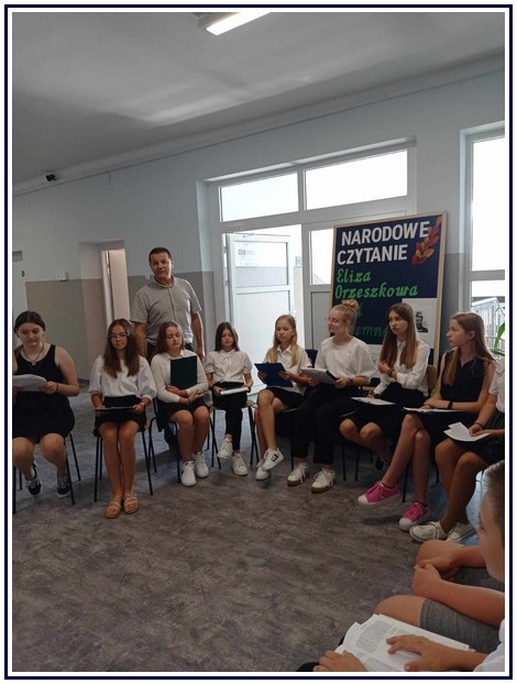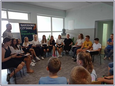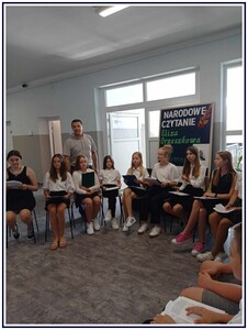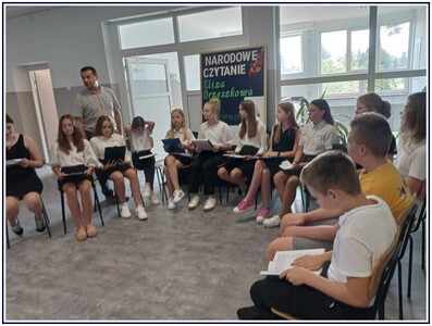 W dalszej części uczniowie zaprezentowali wybrane fragmenty powieści: Lena Skrzypczak, Paulina Skrzypczak, Maja Dąbek, Kaya Sokołowska, Maciek Martyniuk, Piotr Martyniuk, Jessica Szawierszenko, Magda Lipian, Lena Karcz i Gabriela Kozioł.