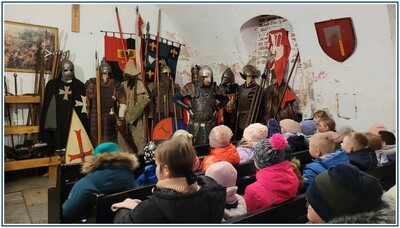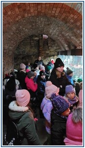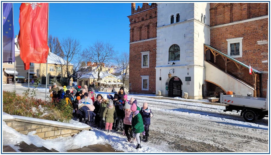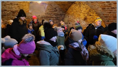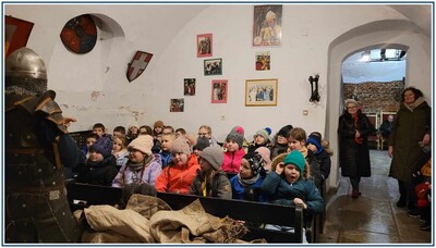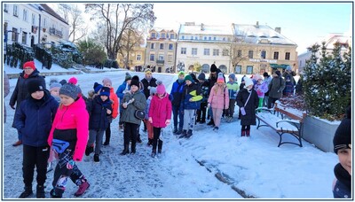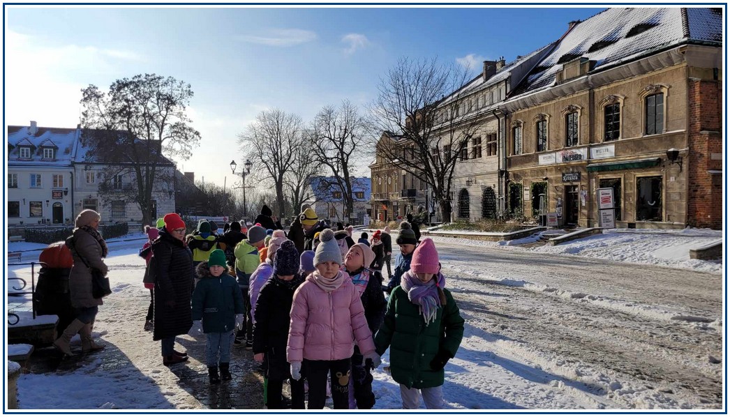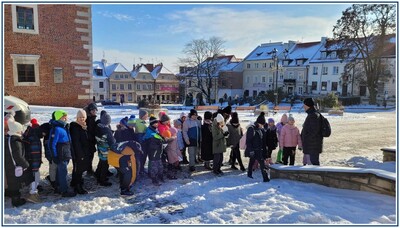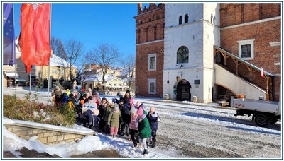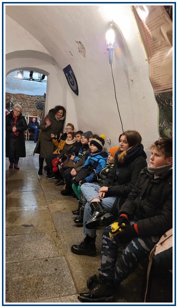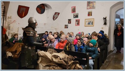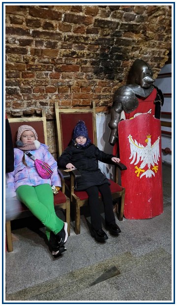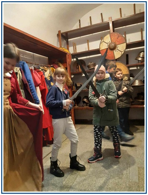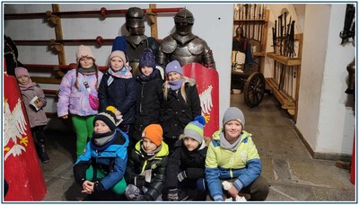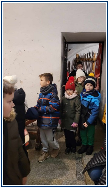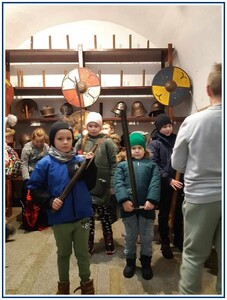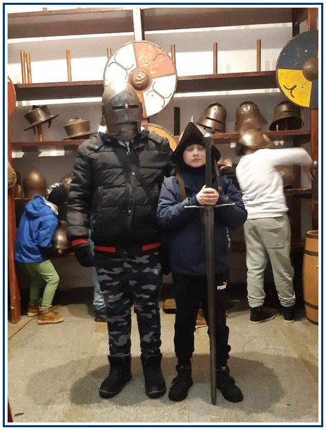 Wycieczka wyruszyła z Nieledwi o wczesnych godzinach porannych i trwała calutki dzień. Program był bardzo bogaty, nie było możliwości ani czasu na nudę. Na rozgrzewkę po przyjeździe do Sandomierza grupa musiała pokonać 6 pięter, aby ujrzeć piękną panoramę miasta, następnie z góry udaliśmy się w podziemia, gdzie odbyliśmy bardzo ciekawą lekcję historii. Później przemieściliśmy się do świata postaci popularnego serialu pt. „Ojciec Mateusz”. Uczniowie obejrzeli piękne figury woskowe w scenerii wprost z ekranu telewizora. Kolejnym punktem naszej wyprawy był spacer po rynku, gdzie dopisała nam piękna słoneczna pogoda, która w połączeniu z bielutkim śniegiem sprawiła, że spacer dodał wszystkim energii i chęci do dalszych przygód. Po miłej przechadzce wybraliśmy się do zbrojowni, gdzie przywitał nas bardzo zabawny rycerz, który opowiedział mnóstwo ciekawostek na temat czasów kiedy żyli rycerze. Uczniowie zobaczyli, a co najważniejsze i najciekawsze przymierzyli zbroje rycerskie, wzięli do rąk miecz, kuszę, halabardę. Dziewczynki mogły na chwilę poczuć się jak renesansowe czy barokowe księżniczki.