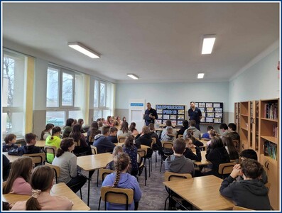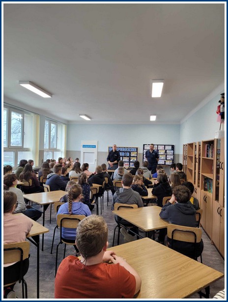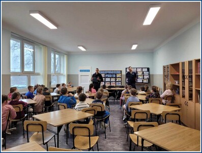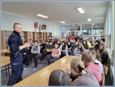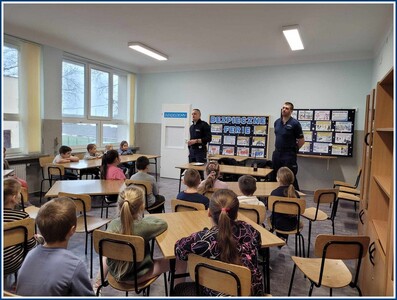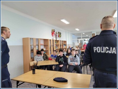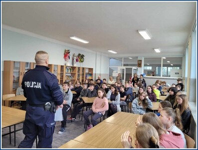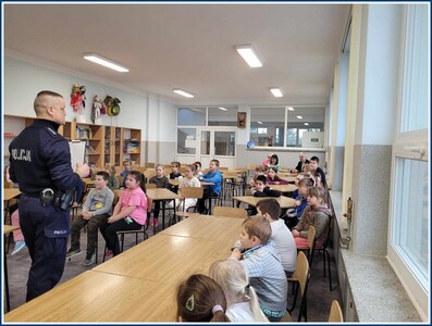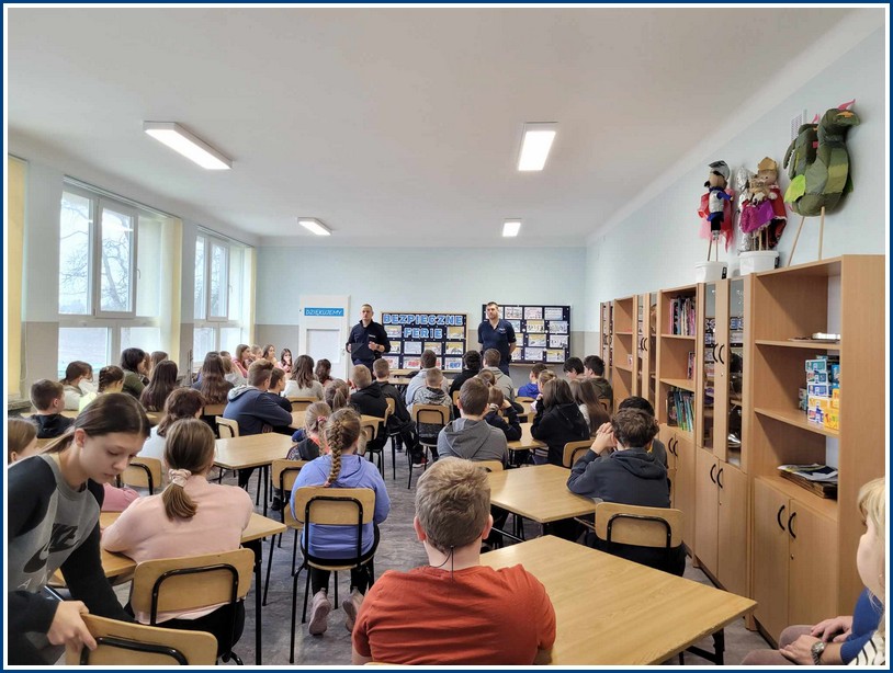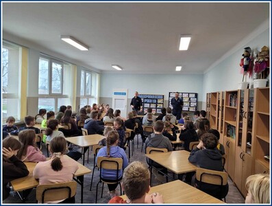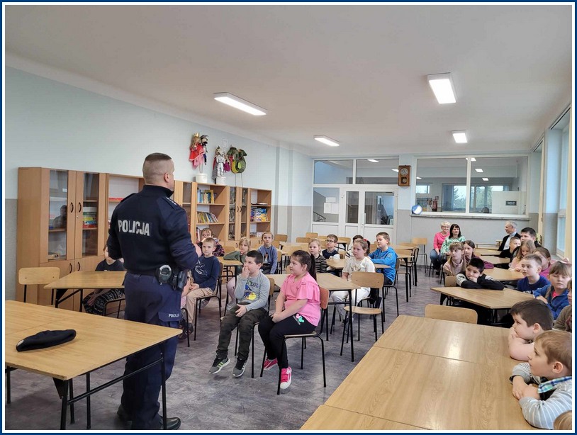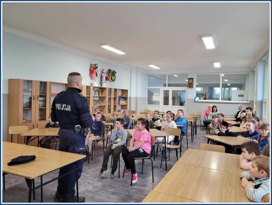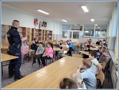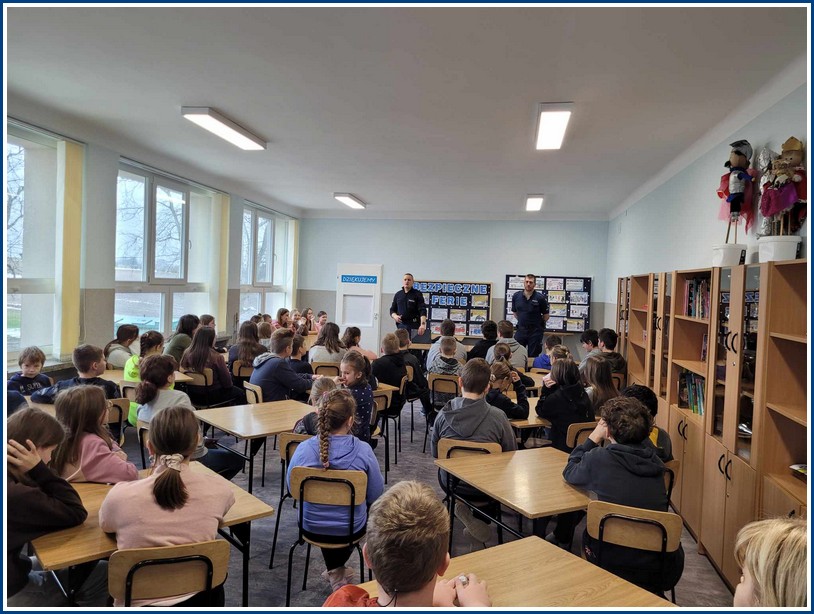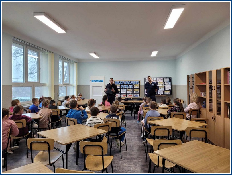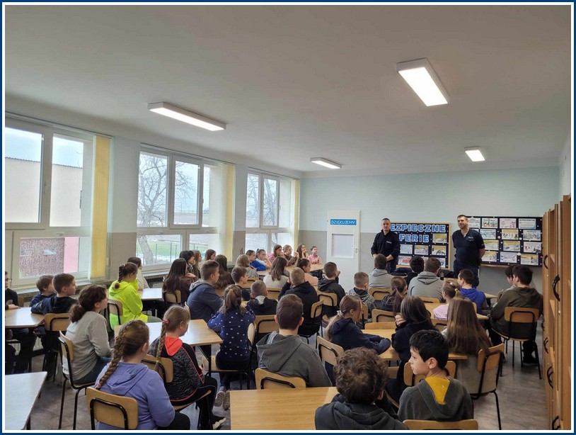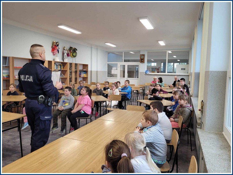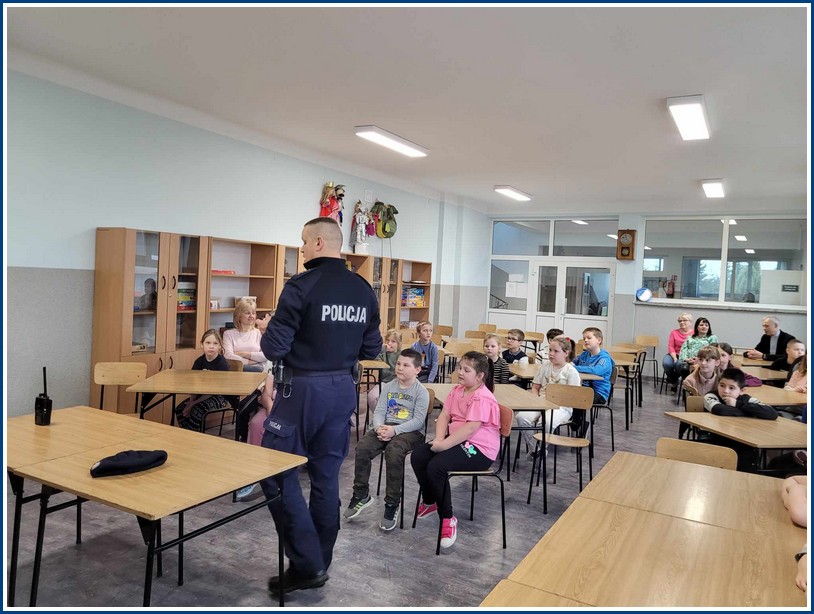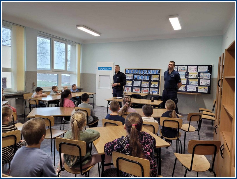 W dniu 25.01.2024r. już tradycyjnie tuż przed feriami zimowymi w naszej szkole odbyło się spotkanie uczniów z Funkcjonariuszami z Posterunku Policji w Trzeszczanach. Podczas pogadanki policjanci rozmawiali z dziećmi na temat zachowania bezpieczeństwa w okresie wypoczynku podczas czasu wolnego od zajęć szkolnych. Przypomnieli dzieciom między innymi jakich zasad należy przestrzegać podczas zabaw na zewnątrz oraz w czasie kiedy przebywają sami w domu. Mundurowi przypomnieli także o numerach alarmowych, z których należy korzystać w sytuacji zagrożenia. Ponadto dzieci dowiedziały się jak postępować w kontakcie z osobami obcymi, a także jakie zagrożenia niesie za sobą korzystanie z niewłaściwych stron internetowych. Dzieci czynnie uczestniczyły w spotkaniu, dzieliły się swoimi spostrzeżeniami i doświadczeniami oraz zadawały wiele pytań, na które otrzymały wyczerpujące odpowiedzi. Bardzo dziękujemy Panom Policjantom Jackowi Wrzyszczowi i Tomaszowi Krukowi za poświęcony czas oraz cenne wskazówki, które z pewnością na długo zapadną w pamięci naszych uczniów.