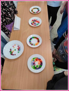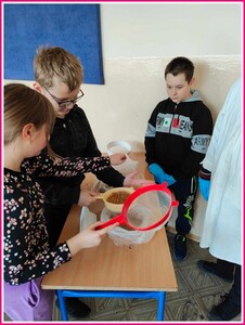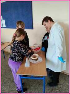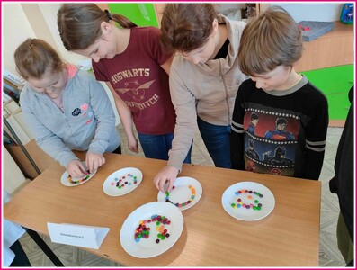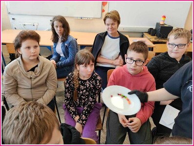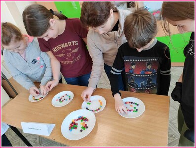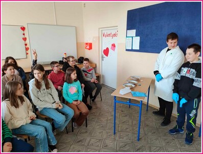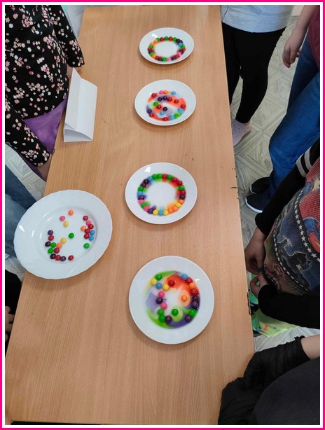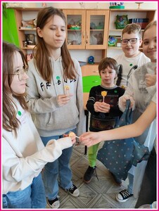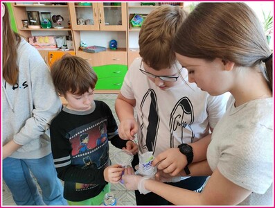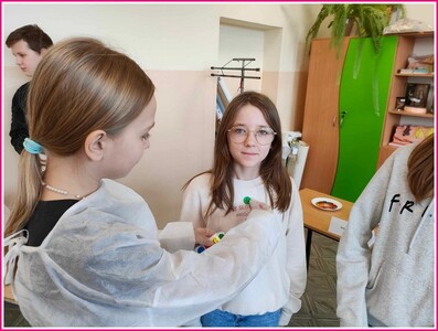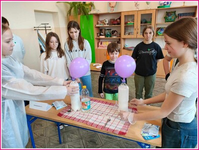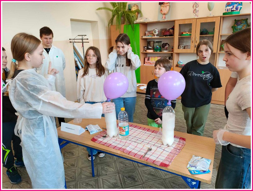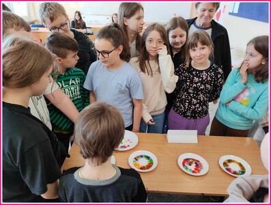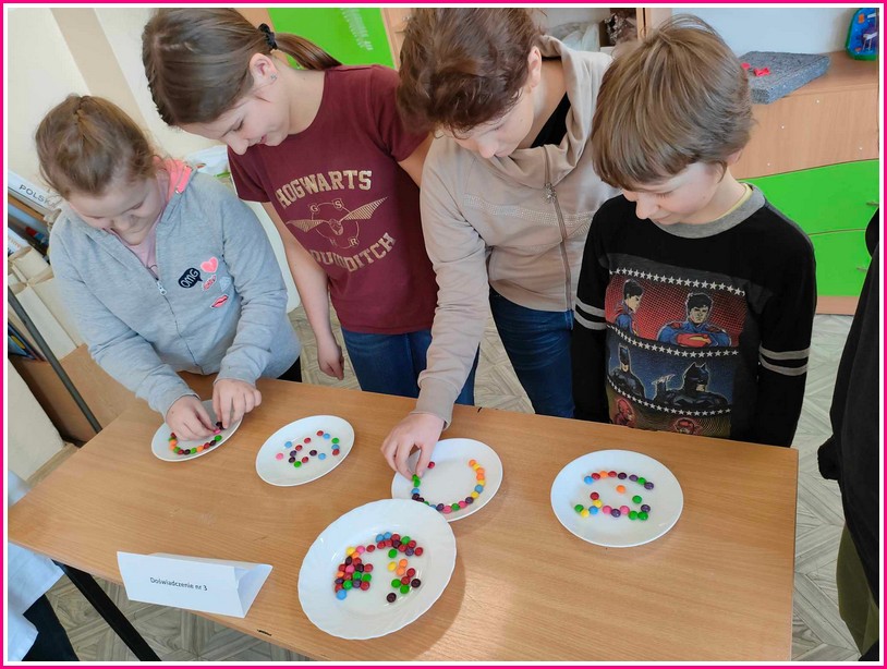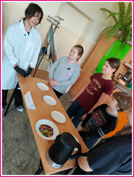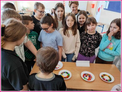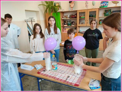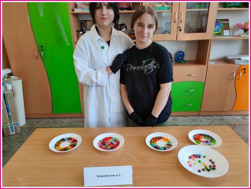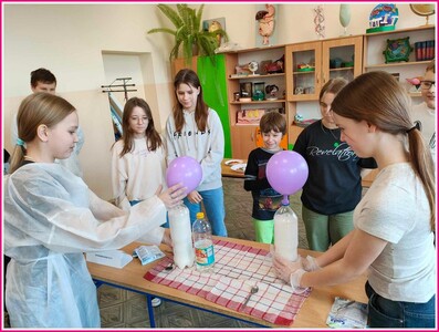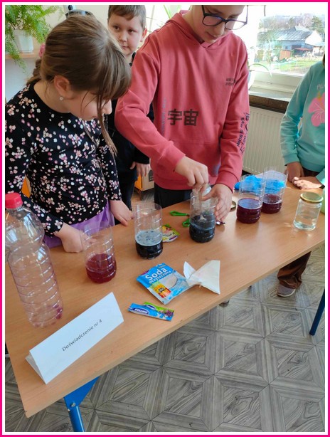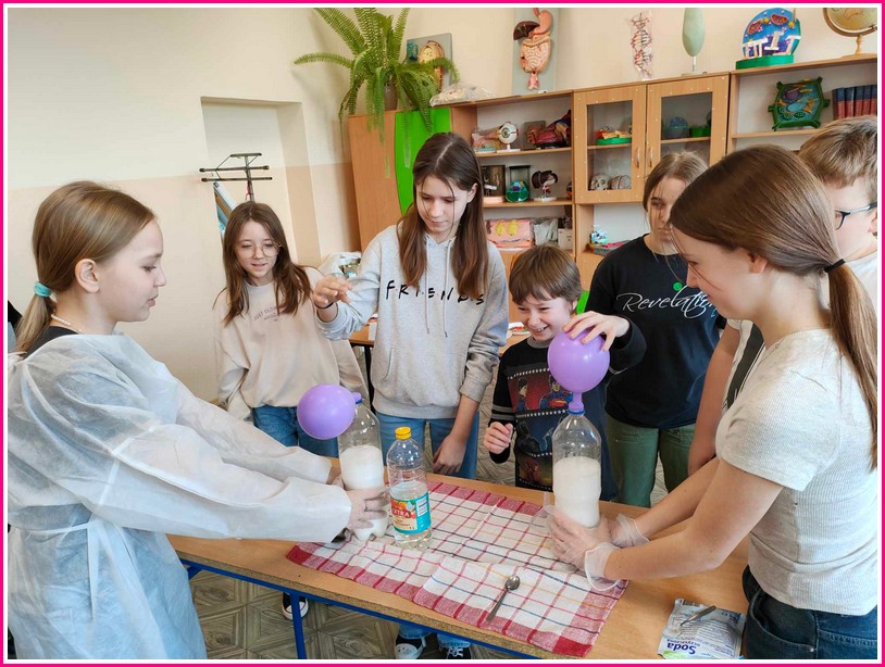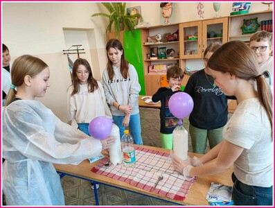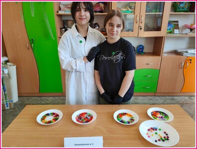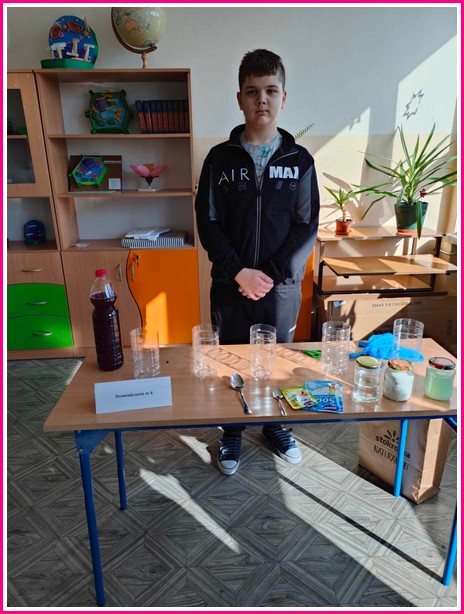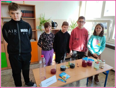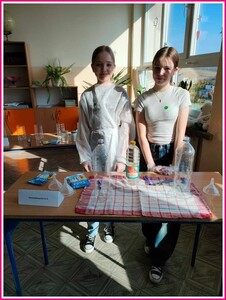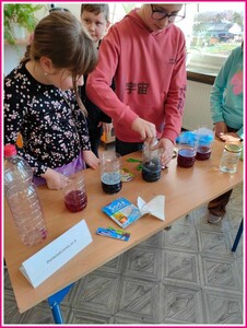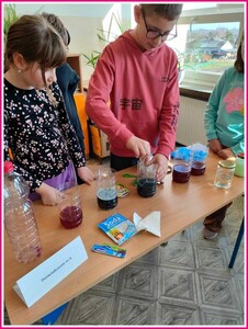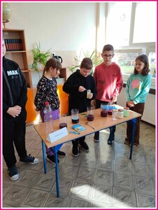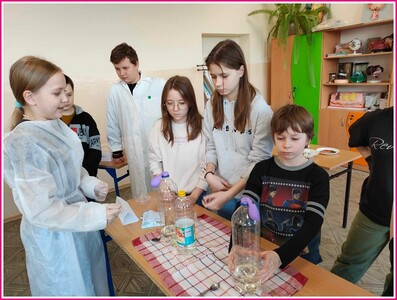 Dzięki uczniom klasy siódmej młodsi koledzy z klasy czwartej poznali; właściwości substancji i sposoby rozdzielania składników mieszanin, zjawisko dyfuzji, zabarwienie wskaznika w różnym środowisku, otrzymywanie i właściwości dwutlenku węgla . Doświadczenia, które przeprowadzili uczniowie były podsumowaniem realizowanego projektu edukacyjnego. Uczestnictwo uczniów z klasy czwartej dało im możliwość poznania zaobserwowanych zjawisk w życiu codziennym od strony naukowej. Dziękujemy zarówno młodym chemikom jak i dzielnym pomocnikom za przygotowanie, prowadzenie i udział w zabawie z chemią.