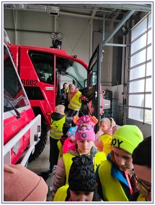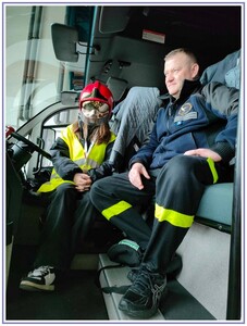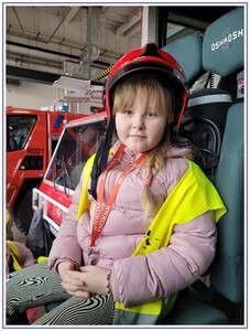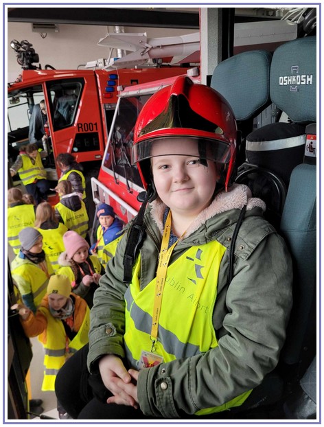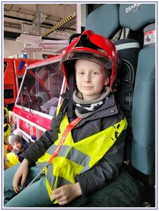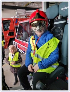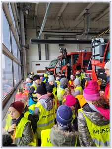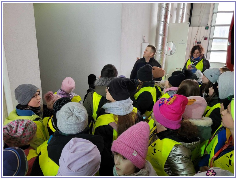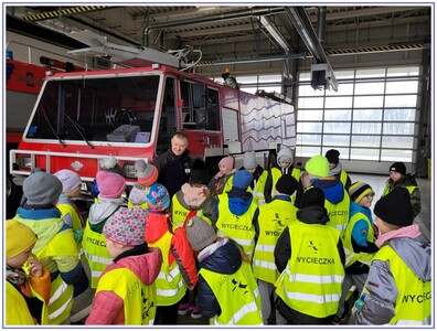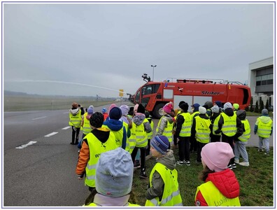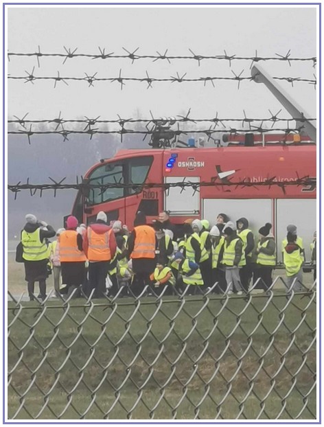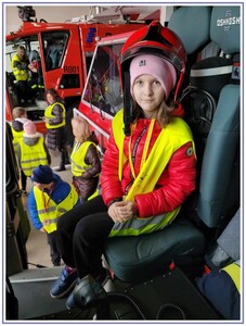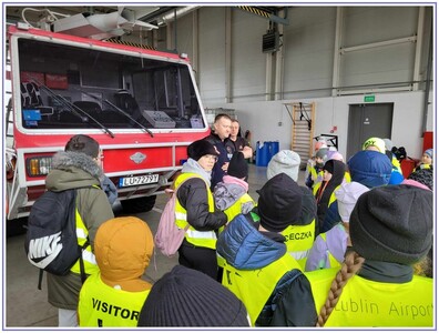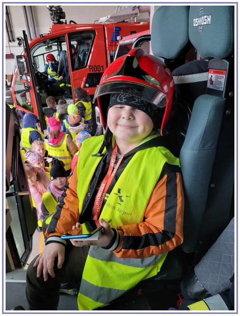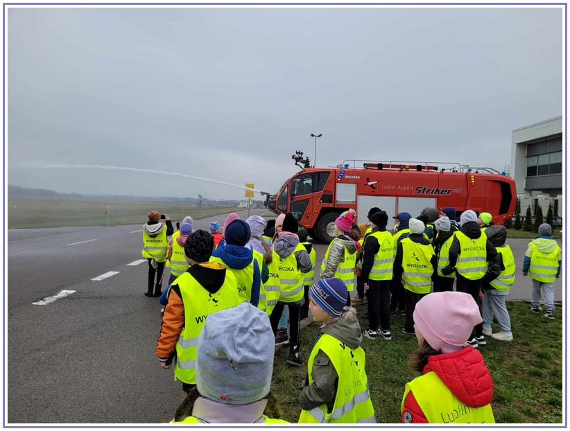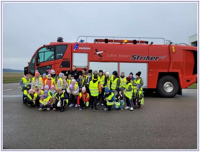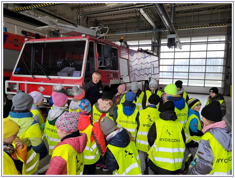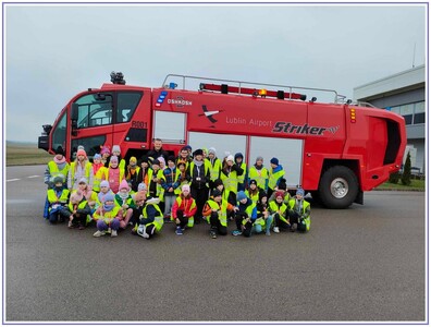 Ostatnim punktem zwiedzania portu była wizyta u Panów strażaków z Lotniskowej służby Ratowniczo-Gaśniczej, którzy zajmują się bezpieczeństwem na lotnisku oraz pasie startowym. Port lotniczy posiada swoje wozy strażackie i inny profesjonalny sprzęt, którym zabezpieczane jest lotnisko. Strażacy zademonstrowali dzieciom wyposażenie wozów strażackich oraz pokazali jak wygląda pierwsza pomoc pasażerom samolotu. Była to bardzo ciekawa i drogocenna lekcja.