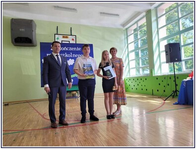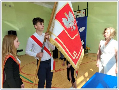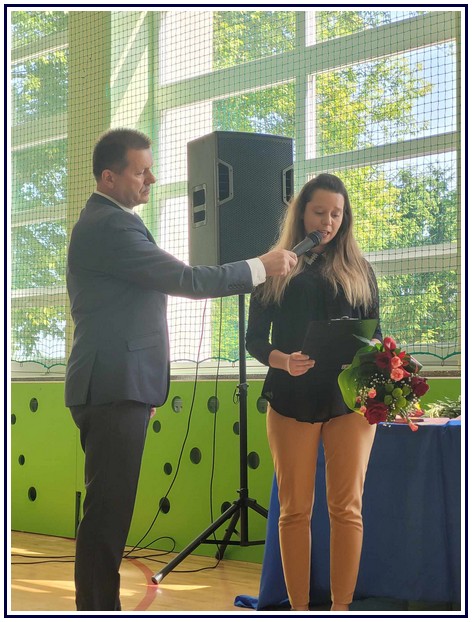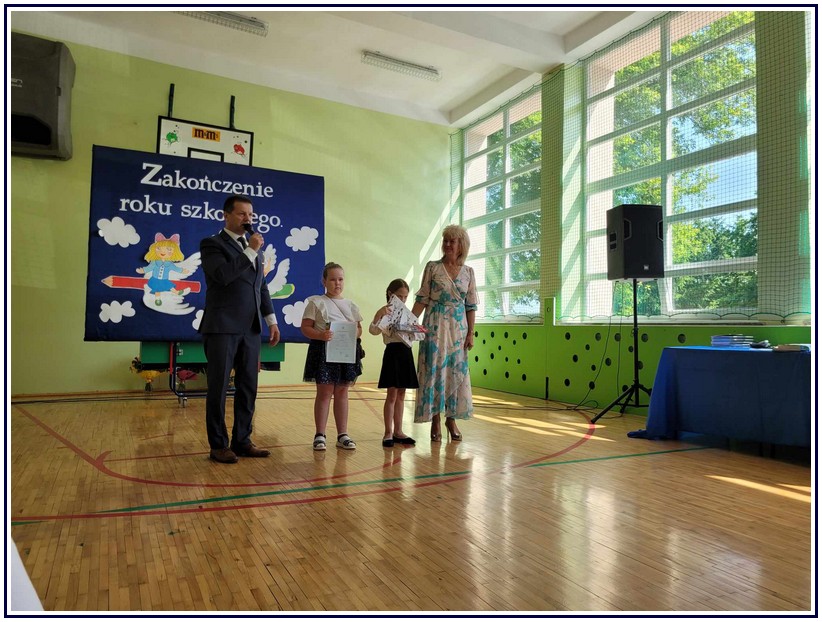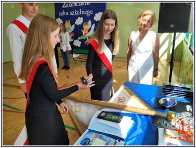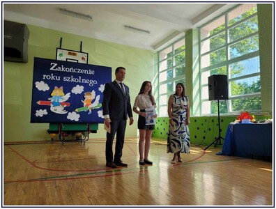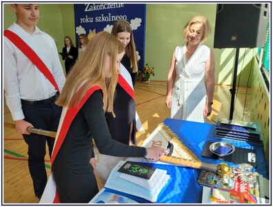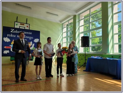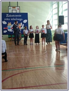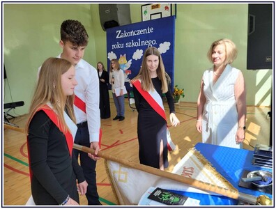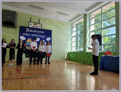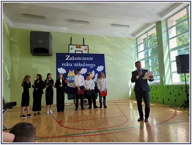 Po mszy świętej wszyscy spotkaliśmy się sali gimnastycznej, gdzie nastąpiło przekazanie sztandaru szkoły, wbicie pamiątkowego gwoździa przez absolwentów, rozdanie świadectw uczniom wyróżnionym oraz pożegnanie klasy ósmej. Podczas przemówienia Pan Dyrektor Andrzej Pachla pogratulował wszystkim uczniom promocji do następnej klasy, podziękował za współpracę nauczycielom oraz za wsparcie i zaufanie rodzicom, a także życzył wszystkim radosnych i bezpiecznych wakacji.