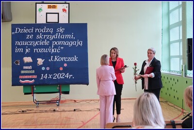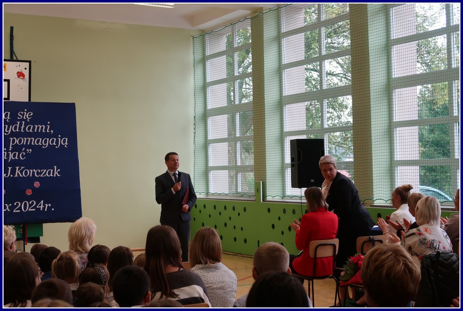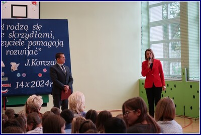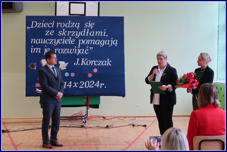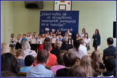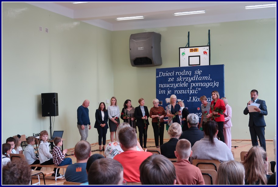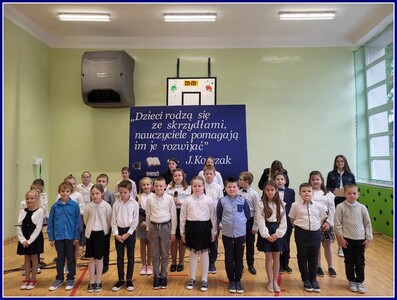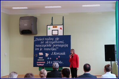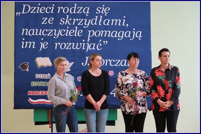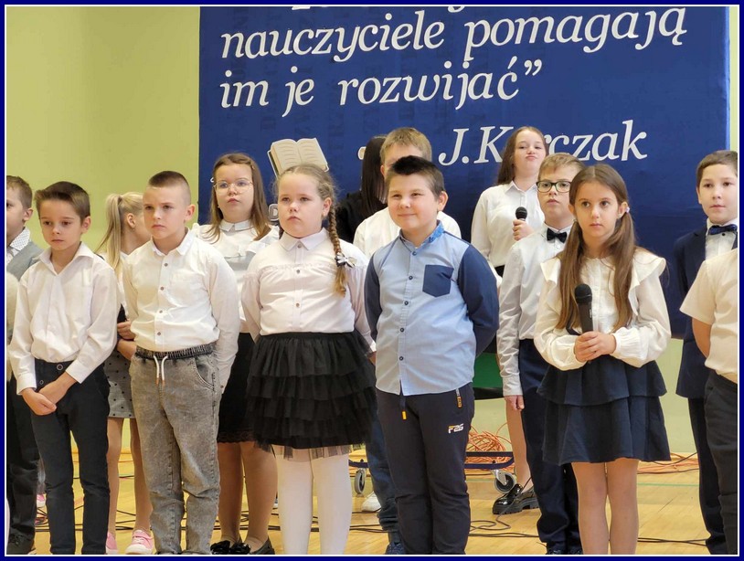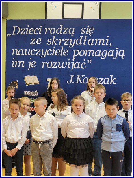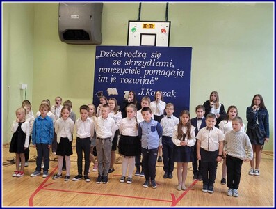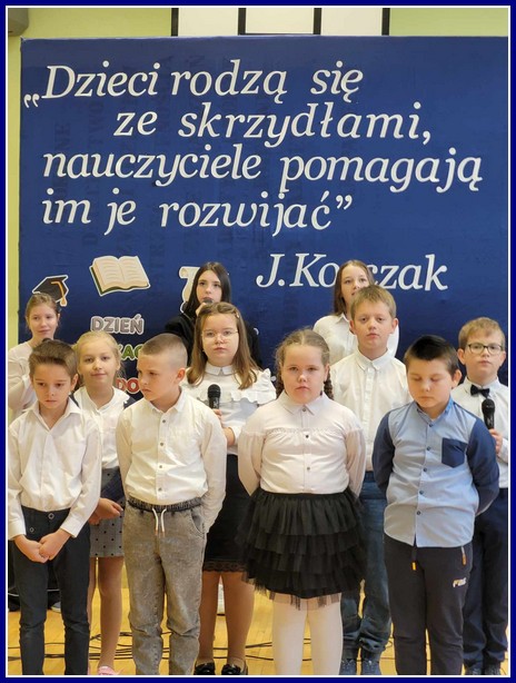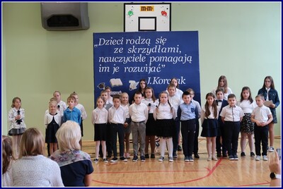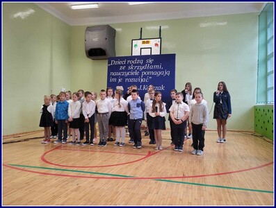 „Dzieci rodzą się ze skrzydłami, nauczyciele pomagają im je rozwijać” pod tym hasłem słynnego pedagoga Janusza Korczaka uczciliśmy obchody Dnia Edukacji Narodowej w naszej szkole, które odbyły się 15 października. Tradycyjnie już akademia została przygotowana przez uczniów klas I– III, pod kierunkiem wychowawczyń, a cały występ uświetnił zespół wokalny prowadzony przez Pana Dyrektora Andrzeja Pachlę. Występ uczniów obfitował w wiele podziękowań oraz licznych słów uznania dla wszystkich nauczycieli naszej szkoły oraz ogólnie pojętego zawodu nauczyciela. Nasi najmłodsi uczniowie z zaangażowaniem oraz wielkim przejęciem prezentowali swoje umiejętności recytatorskie, bardzo starali się przekazać swoją wdzięczność w każdym wierszu i piosence.