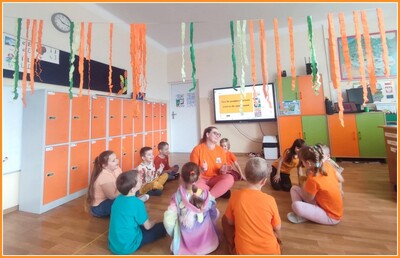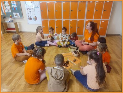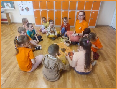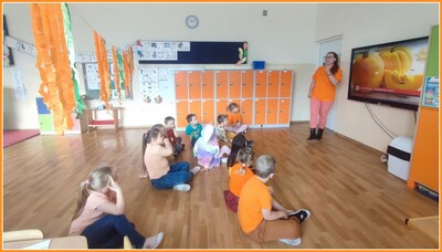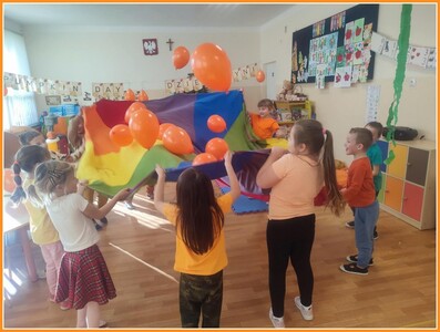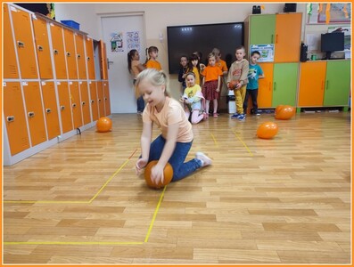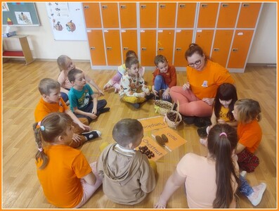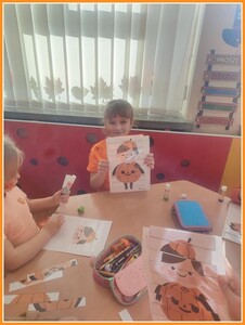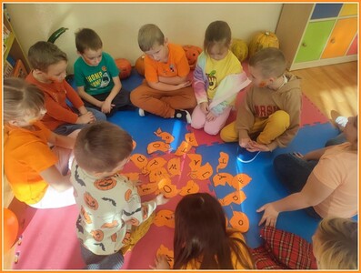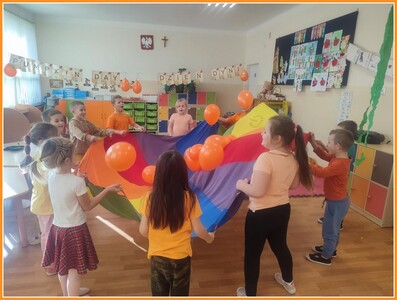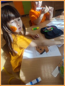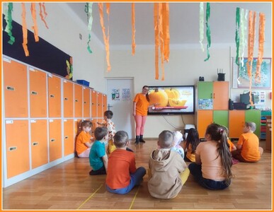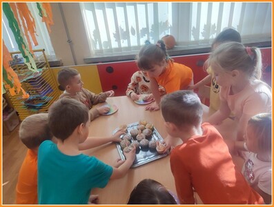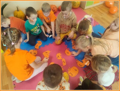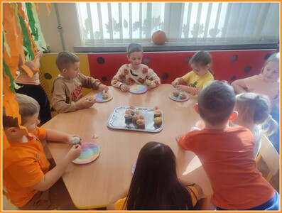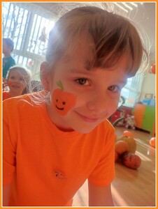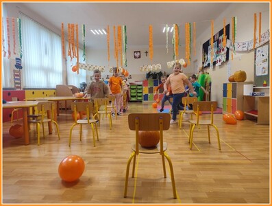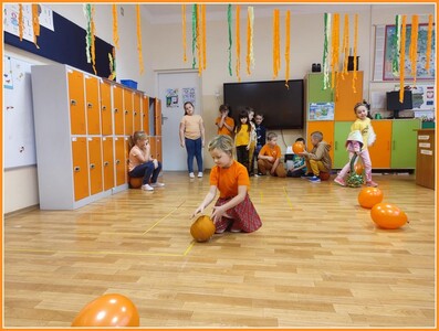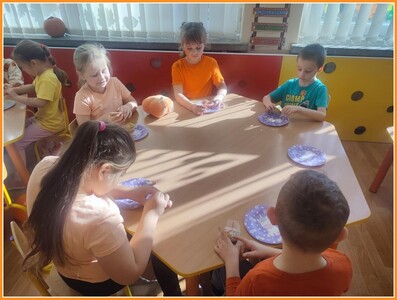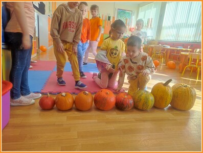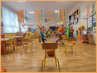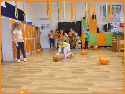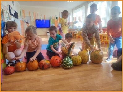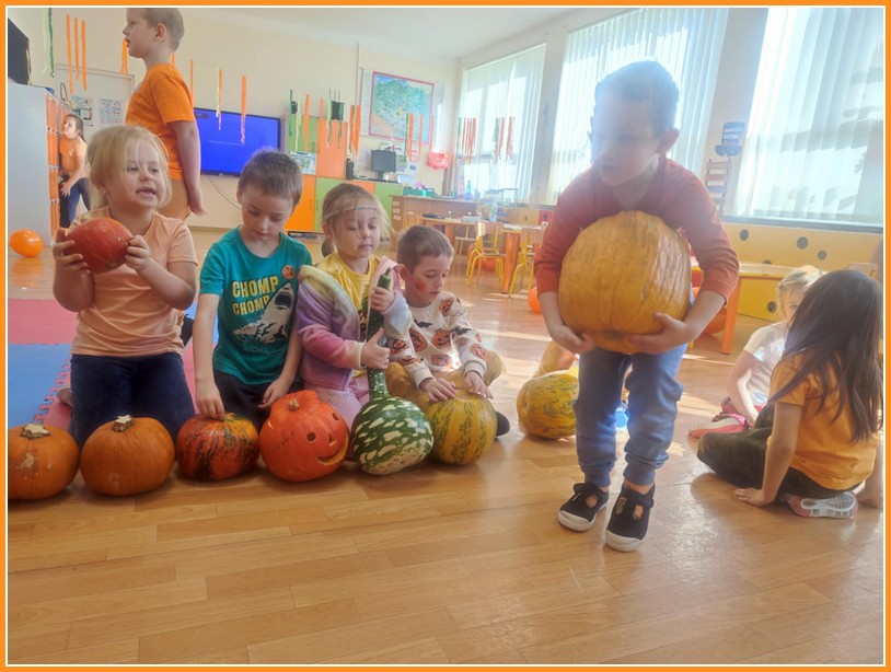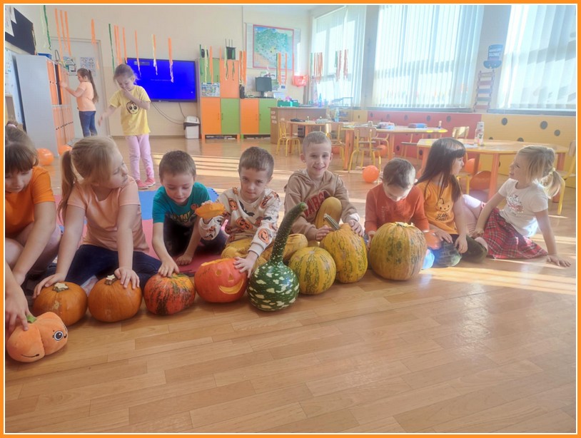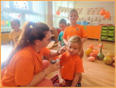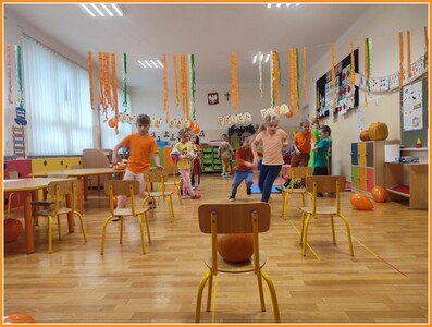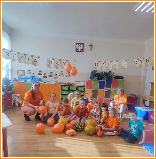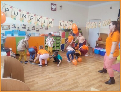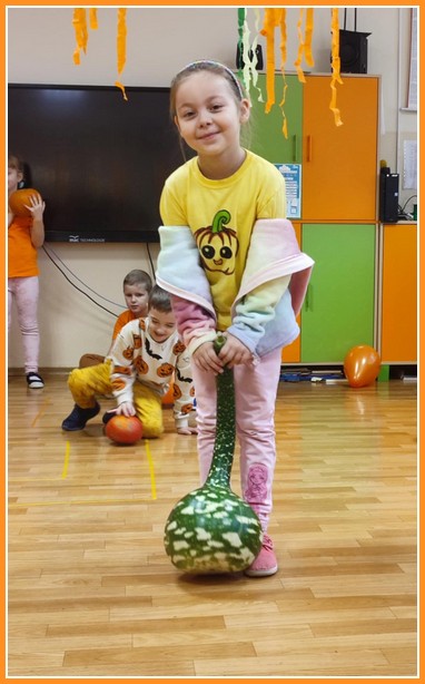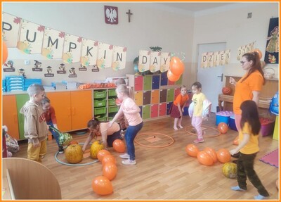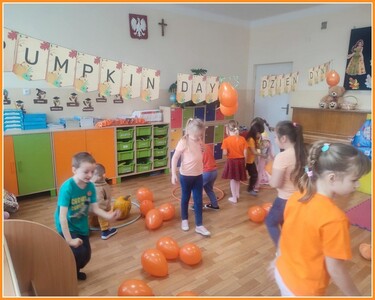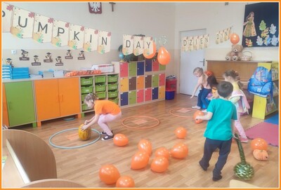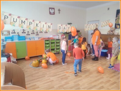 Podczas zajęć z wychowawczynią dzieci poznały wielką różnorodność dyń i wzbogaciły wiedzę na ich temat. Dowiedziały się, że dynia jest bardzo zdrowym warzywem, że można z niej przygotować wiele dań. Dzieci brały udział w zabawach z dyniami: klasyfikowanie dyń wg wielkości, koloru, kształtu, wagi, szeregowanie od największej dyni do najmniejszej, przeliczanie dyń i wiele innych. Wśród zabaw ruchowych były dyniowe kręgle, skoki przez różnej wielkości dynie, slalom dyniowy oraz zabawy taneczne. Podczas zajęć z języka angielskiego dzieci zostały wtajemniczone w kontekst kulturowo-językowy, zobaczyły jak ciekawie obchodzony jest ten dzień w USA, poznały wydarzenie Punkin Chunkin, miały okazję połączyć naukę języka z aktywnością taneczną. Śpiewały piosenkę „Pass the pumpkin”, utrwalały też słownictwo związane z jesienią. Jako niespodziankę Panie przygotowały dla dzieci malowanie twarzy oraz fotobudkę. Ten dzień przyniósł wiele niezapomnianych wrażeń, radości i zabawy. Na koniec przedszkolaki delektowały się dyniowymi smakołykami, przygotowanymi przez rodziców.