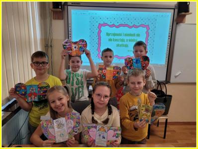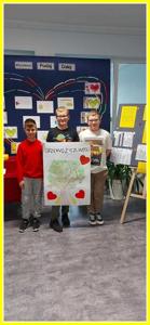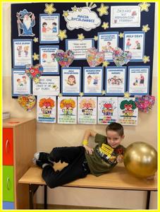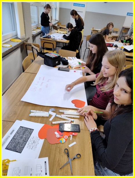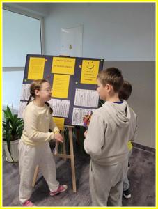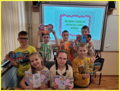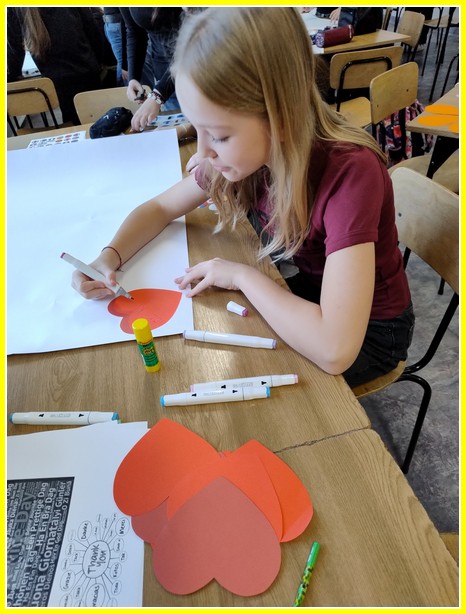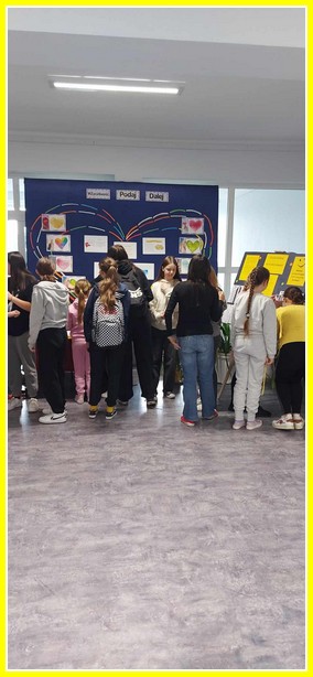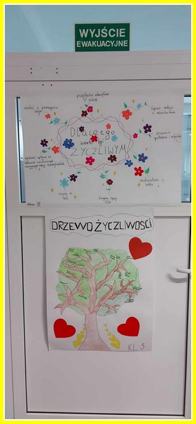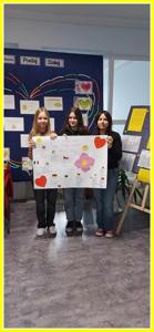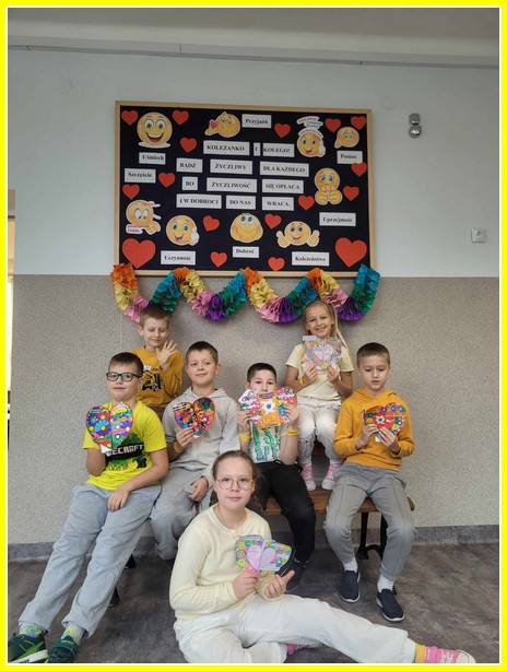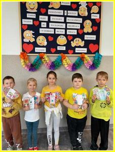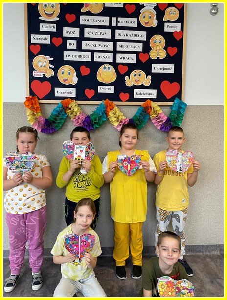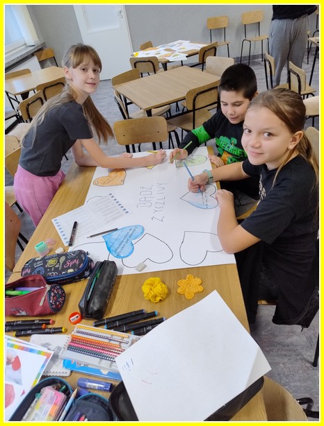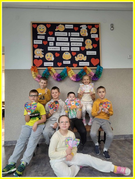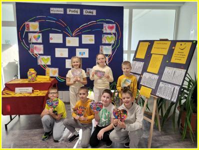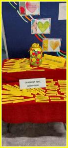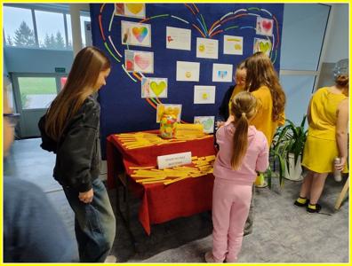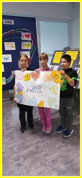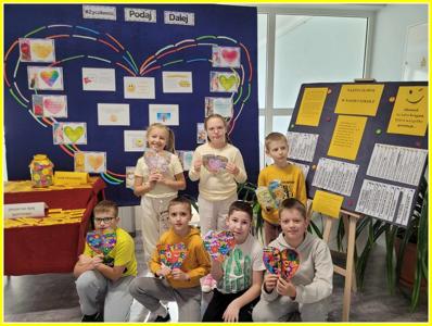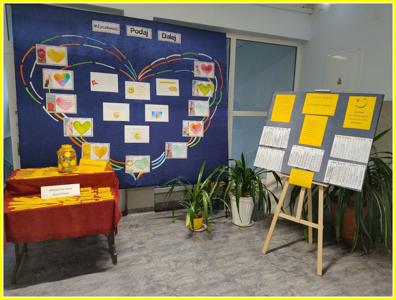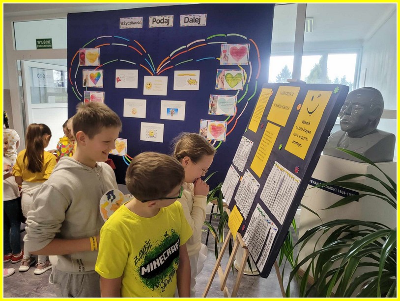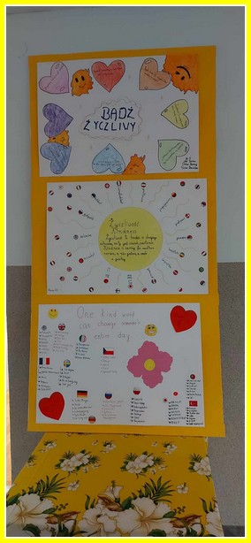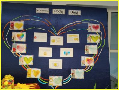Kolejnym działaniem było wykonanie plakatów na tematy związane z życzliwością. Przedstawiciele klas 4-8 wykonali prace w języku polskim oraz w językach obcych. Z kolei uczniowie klas 0-3 wykonali składane serca. Z prac uczniów została skomponowana wystawka na dolnym korytarzu.
