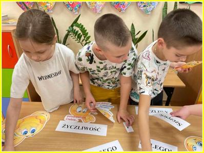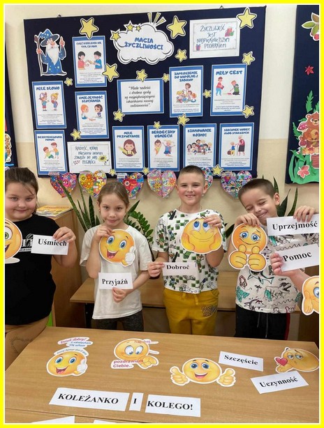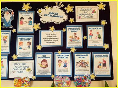 Nauczycielki klas I – III zapoznały uczniów z bajką pt. „Zaczarowany flet” oraz przeprowadziły dyskusję, na jej temat. Uczniowie samodzielne przygotowali „Życzliwe kartki” dla swoich bliskich, w których wpisywali krótkie pozdrowienia, życzenia lub coś miłego (np. rysunek), co ucieszy obdarowaną osobę. Wspólnie wykonali „Skojarzenia w rysunkach” - (historyjki, rysunki, komiksy), które przedstawiały sytuacje i zachowania ludzi kojarzące się z życzliwością. Rozwiązywali krzyżówkę z hasłem „Życzliwość”. Uczestniczyli w zabawach „Dobre uczynki”, „Magiczne słowa”. Wykonali gazetkę "Magia Życzliwości".