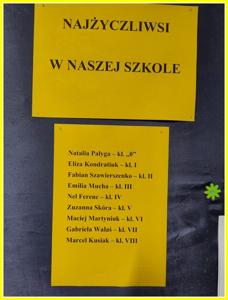 We współpracy z wychowawcami przeprowadzony został Plebiscyt na Najżyczliwszą Koleżankę/Najżyczliwszego Kolegę z każdej klasy. Wyniki prezentujemy poniżej: