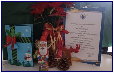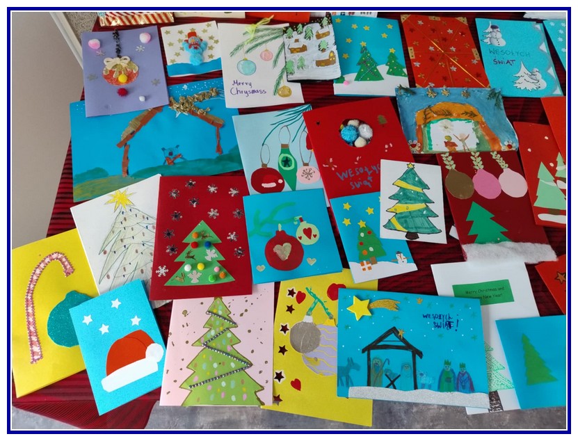 Świąteczny czar już nas otacza, w domach zapach pieczonych pierników i piękny widok kolorowej choinki cieszą nasze serca. Uczniowie naszej szkoły pamiętają o tych, którzy nie będą mieli szczęściaspędzić świąt w swoich domach. Z tego powodu przygotowaliśmy kartki z życzeniami dla dzieci i młodzieży przebywających w czasie świąt na oddziale pediatrycznym Wojewódzkiego Szpitala im. Jana Pawła II w Zamościu. Życzenia zdrowia przekazujemy zarówno w języku polskim, angielskim oraz rosyjskim.