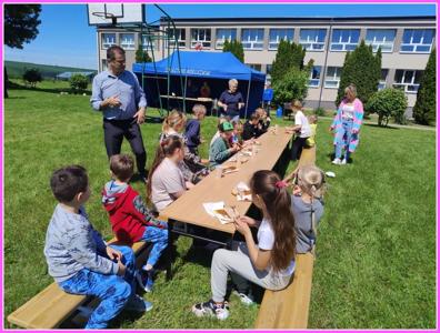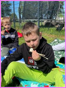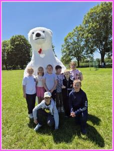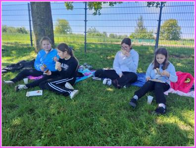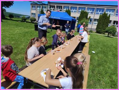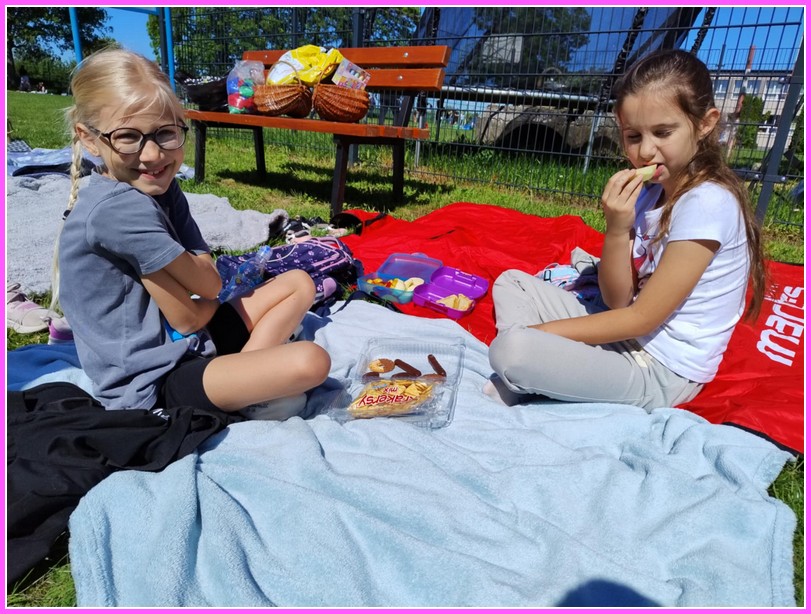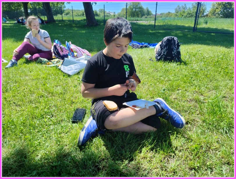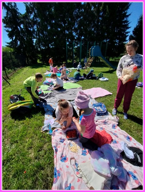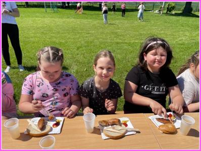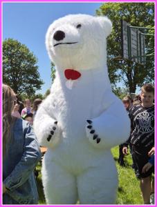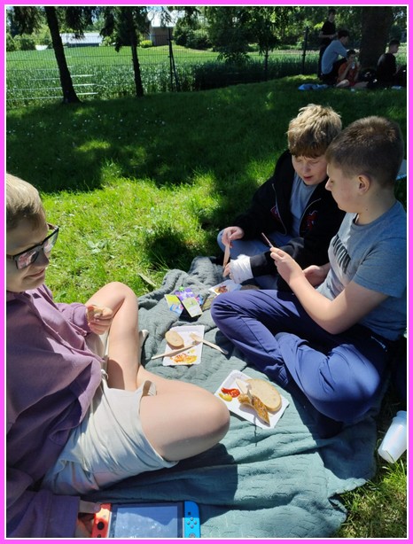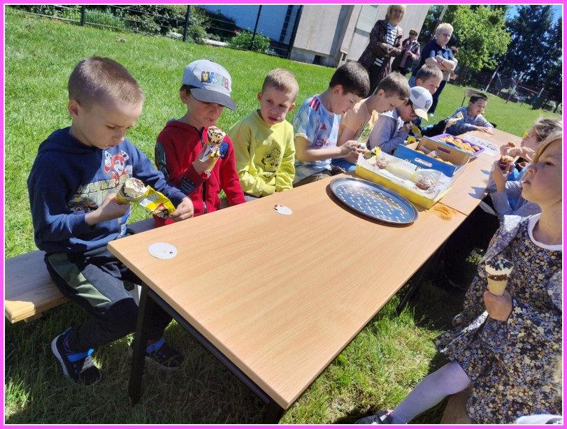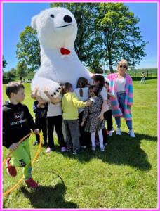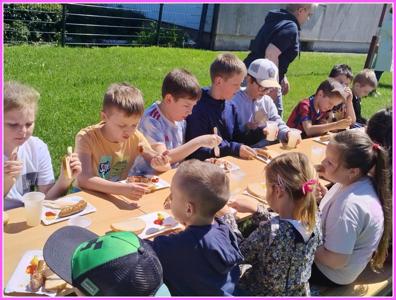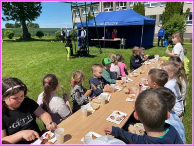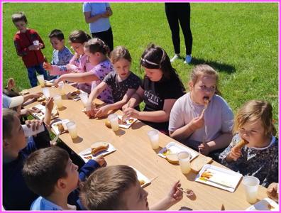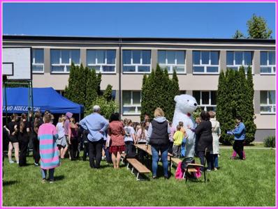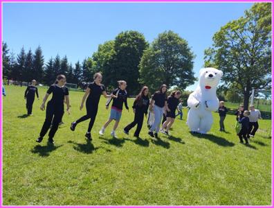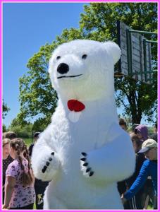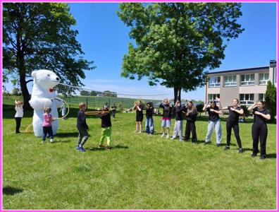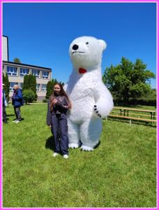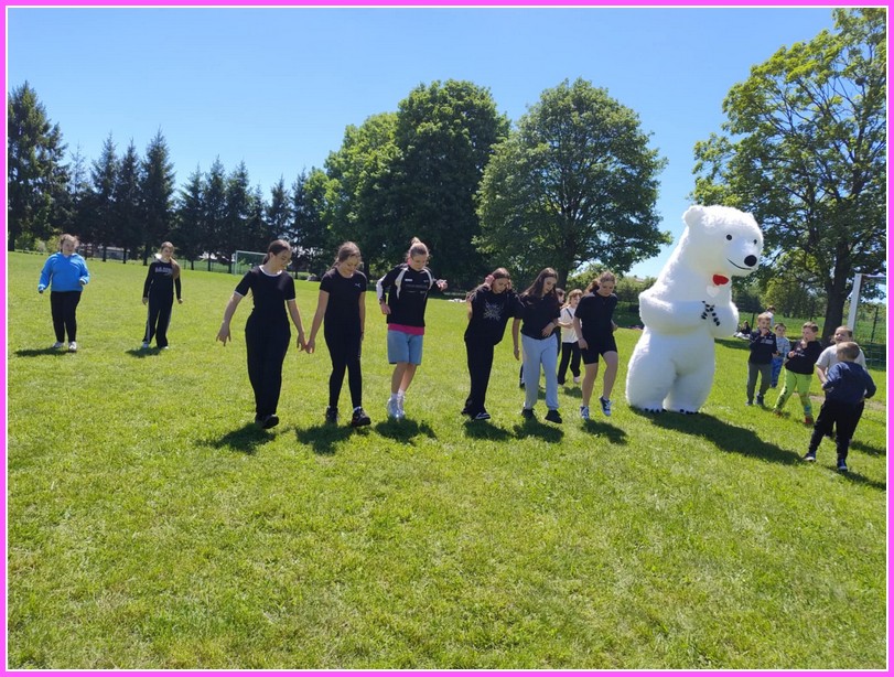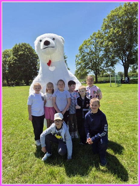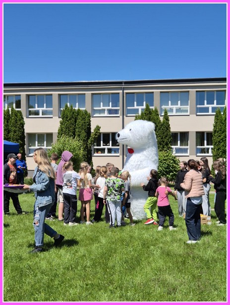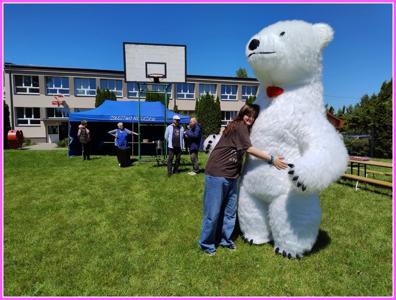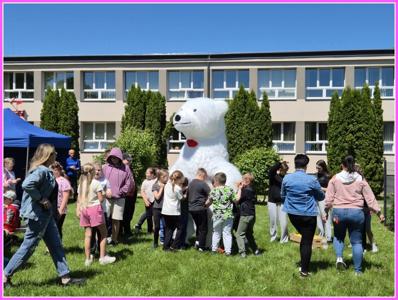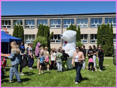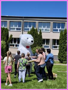 Wszystkie klasy miały również okazję do wspólnego piknikowania, co sprzyjało integracji i budowaniu szkolnej wspólnoty. Zamiast tradycyjnego obiadu, czekała na wszystkich pyszna grillowana kiełbaska, a na deser – niespodzianki przygotowane przez Radę Rodziców: lody i muffinki, które zachwyciły wszystkich obecnych. Szczególną atrakcją był wielki biały miś, który odwiedził naszą szkołę, wywołując ogromną radość, mnóstwo śmiechu i pozytywnych emocji .