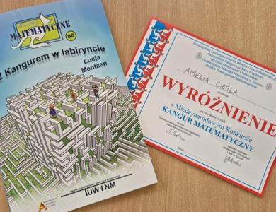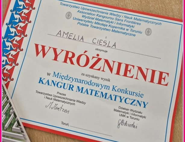 Z radością informujemy, że Amelia Cieśla, uczennica klasy trzeciej, została wyróżniona w międzynarodowym konkursie matematycznym "KANGUR". Amelia startowała w kategorii "Maluch" i świetnie poradziła sobie z wymagającymi zadaniami, wykazując się logicznym myśleniem, spostrzegawczością i matematyczną kreatywnością.