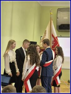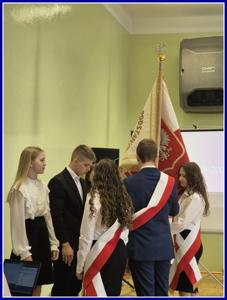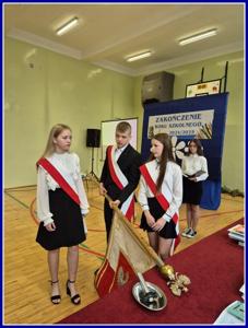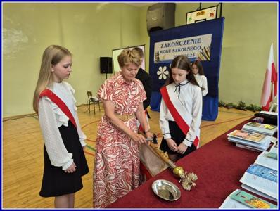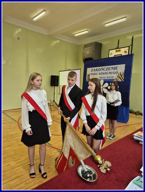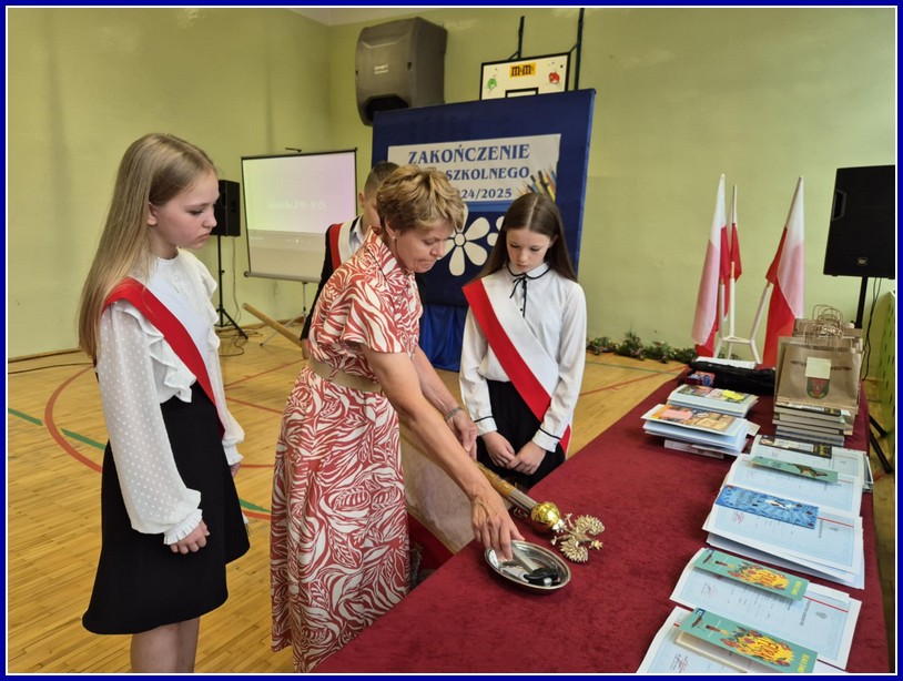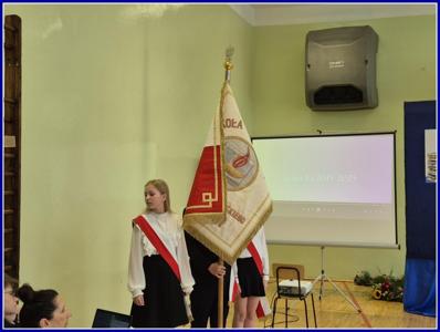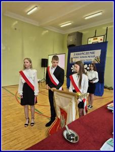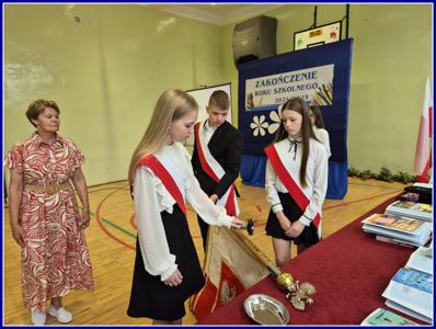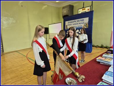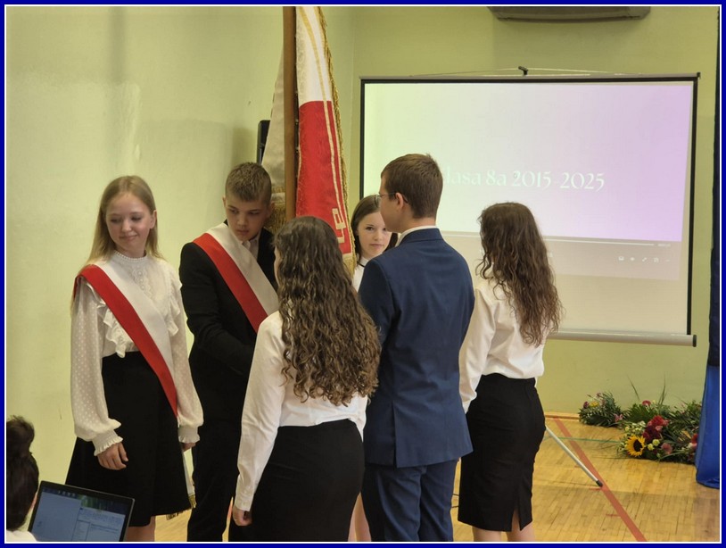 Jednym z najbardziej symbolicznych momentów wydarzenia było tradycyjne wbicie gwoździa w drzewiec sztandaru przez tegorocznych absolwentów z klasy ósmej oraz ich wychowawczynię, panią Dorotę Maciąg. To piękny gest, który na trwałe wpisuje się w historię naszej szkoły i stanowi wyraz wdzięczności ósmoklasistów.Nie zabrakło również wzruszającego przekazania sztandaru – uczniowie klasy VIII przekazali go swoim młodszym kolegom z klasy VII, którzy zobowiązali się godnie reprezentować szkołę. Kolejnym ważnym punktem programu było wręczenie świadectw ukończenia szkoły podstawowej. Absolwenci klasy ósmej odebrali je z rąk Pana Dyrektora i swojej wychowawczyni. Następnie uczniowie wygłosili pożegnalne przemówienie, dziękując nauczycielom i pracownikom szkoły za lata wsparcia i nauki. Wzruszającym akcentem była również prezentacja slajdów z życia klasy, przypominająca najważniejsze i najpiękniejsze chwile wspólnie spędzonych lat. Ósmoklasistów pożegnali również uczniowie klasy siódmej, którzy wręczyli im symboliczne upominki i złożyli najlepsze życzenia na nowej drodze edukacyjnej.