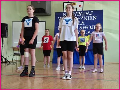 Uroczystość rozpoczął występ taneczny dziewcząt naszej szkoły: „Mam super moce”, następnie uczennice – Lena Skrzypczak i Wiktoria Gawron – wcieliły się w role narratorek i przedstawiły kolejne etapy działań projektowych. Wysłuchaliśmy piosenki w wykonaniu chórku pod tytułem: „Online”, która w symboliczny sposób nawiązywała do tematyki projektu.