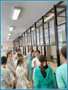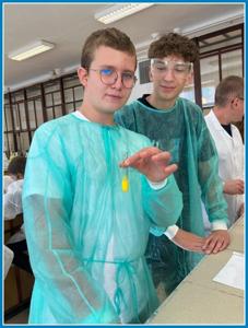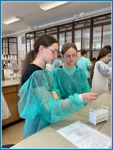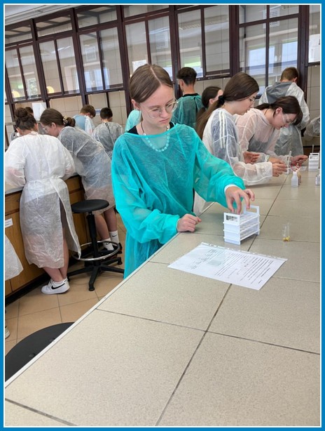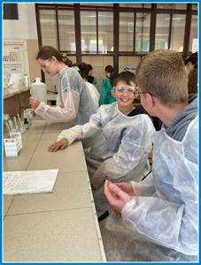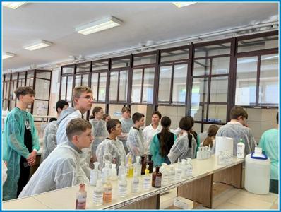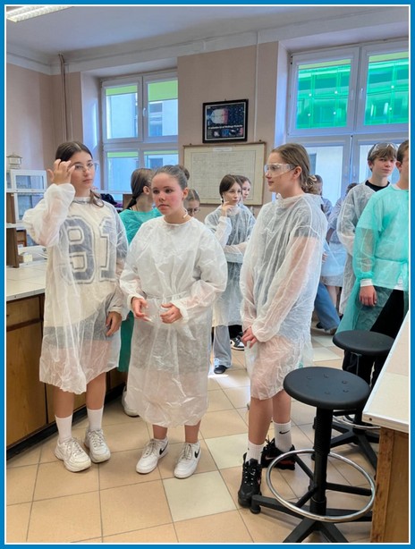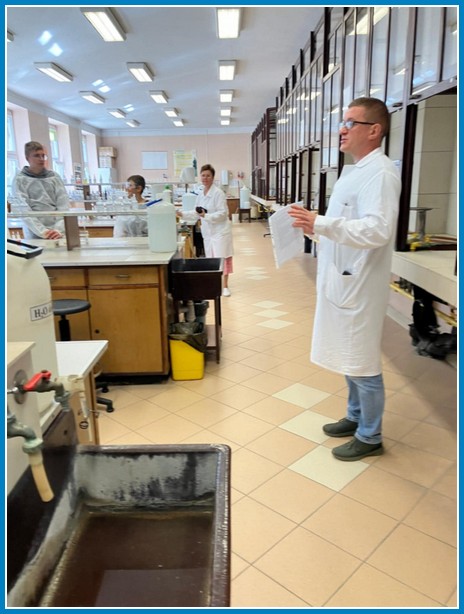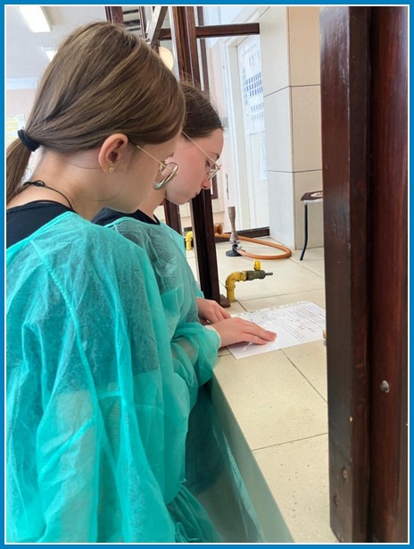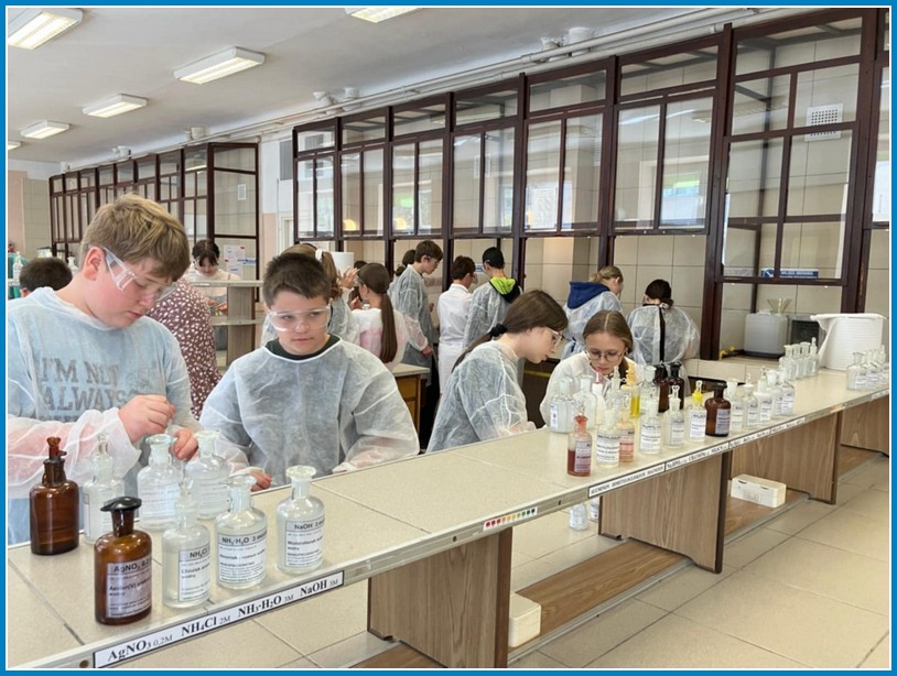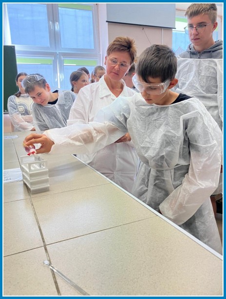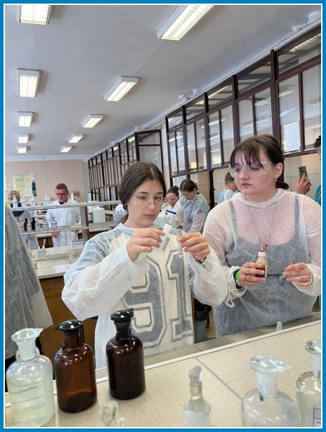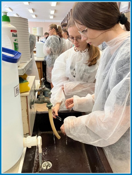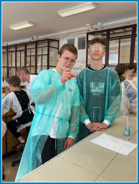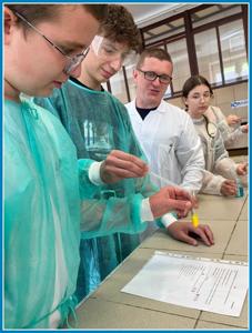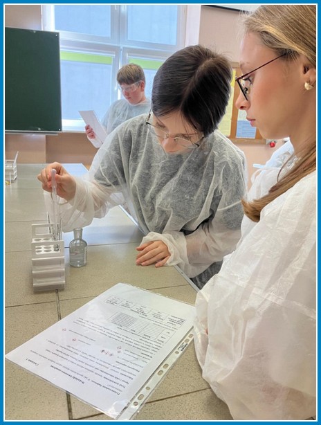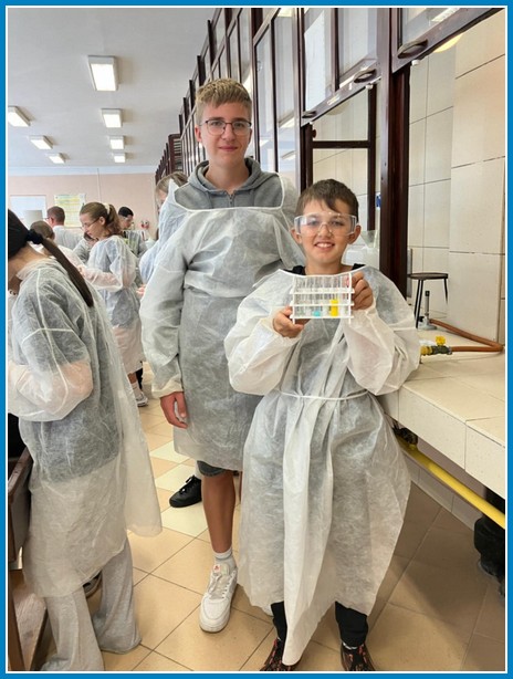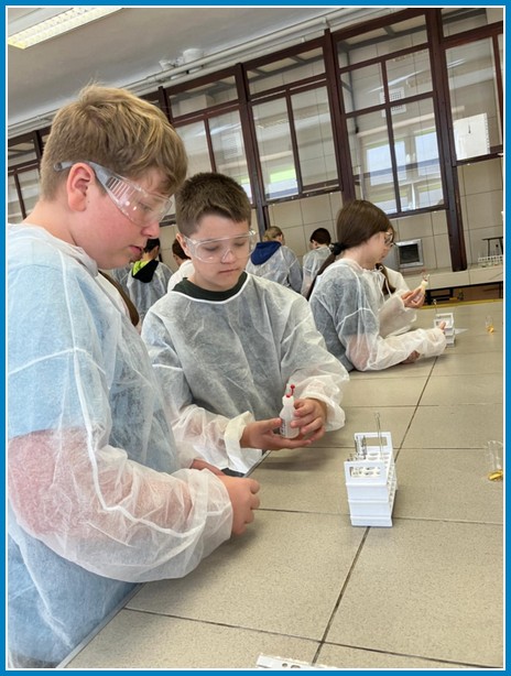 Podczas warsztatów laboratoryjnych uczniowie, ubrani w odpowiedni strój ochronny i okulary, samodzielnie przeprowadzali doświadczenia chemiczne, pracując w parach przy stanowiskach laboratoryjnych. Była to doskonała okazja do wykorzystania wiedzy w praktyce, poznania zasad pracy w laboratorium oraz poczucia się jak prawdziwi chemicy.