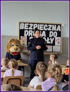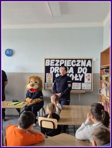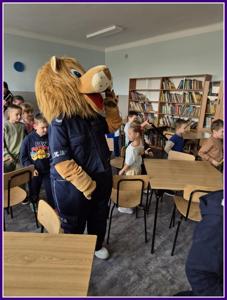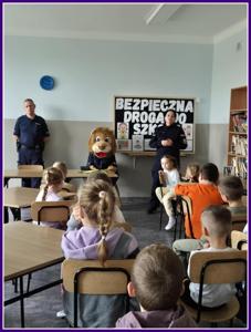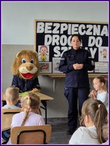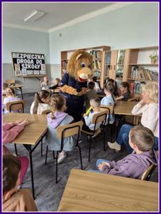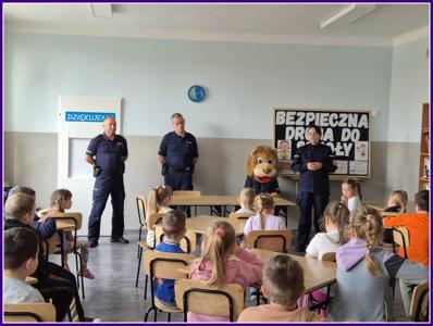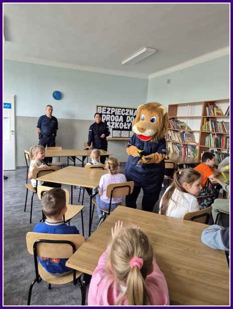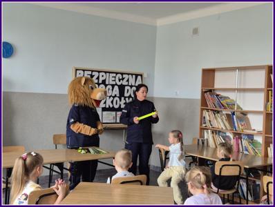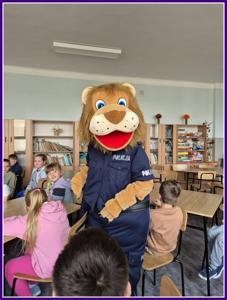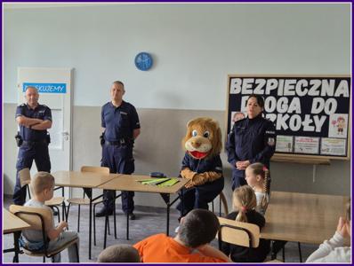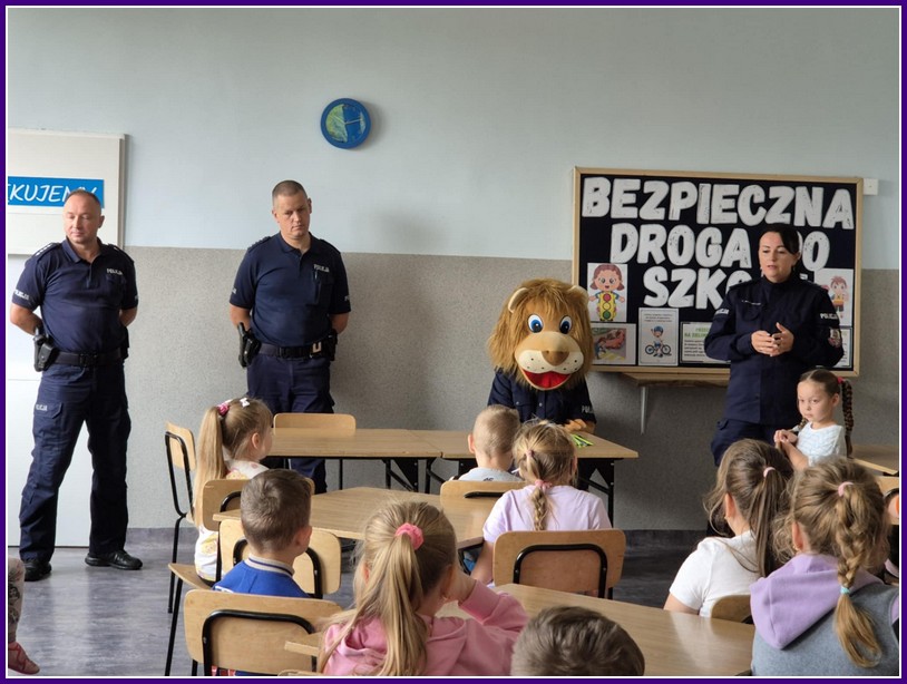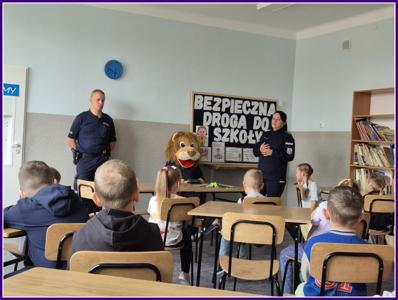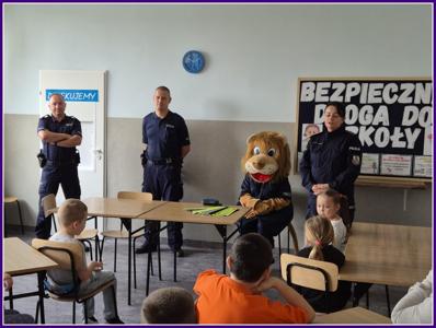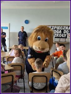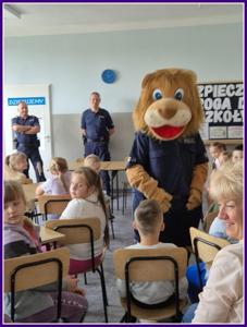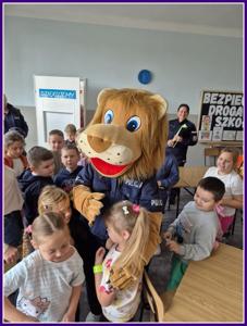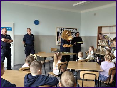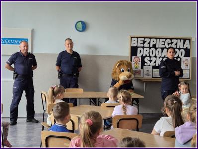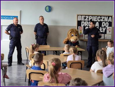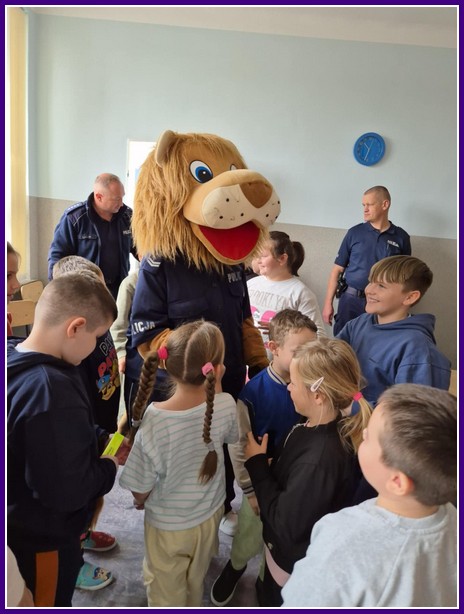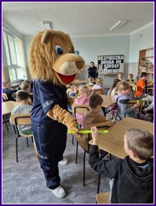 1 października naszą szkołę odwiedzili funkcjonariusze policji: pani Edyta Krystkowiak z Komendy Powiatowej Policji w Hrubieszowie oraz panowie Krzysztof Jańczuk i Jacek Wrzyszcz z Posterunku Policji w Trzeszczanach. Towarzyszyła im również wyjątkowa niespodzianka – policyjna maskotka, lew.