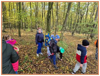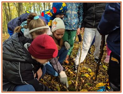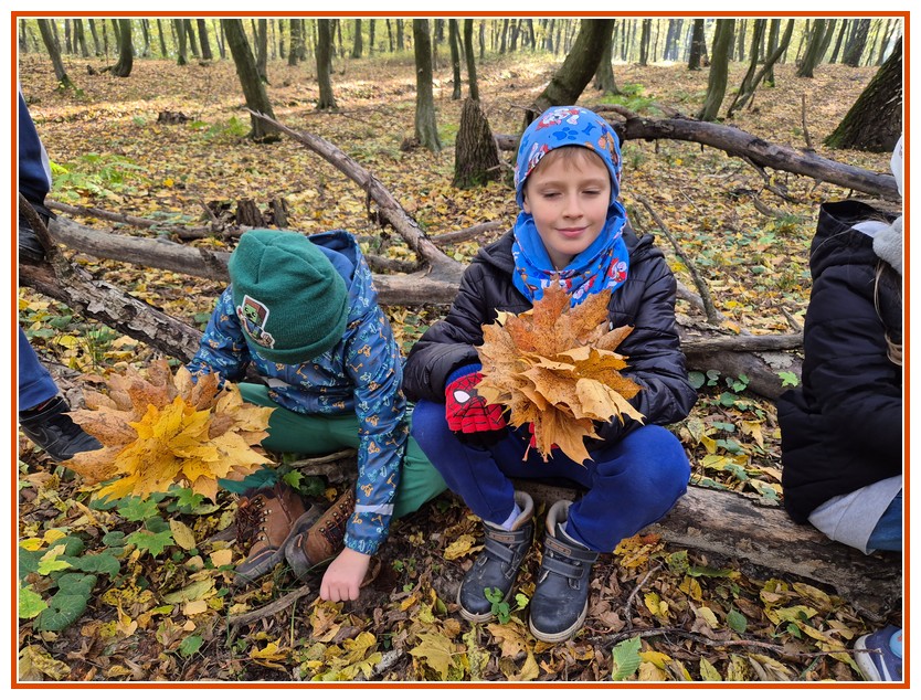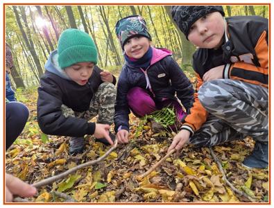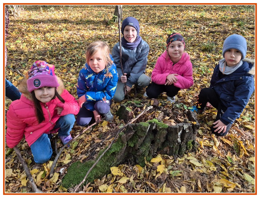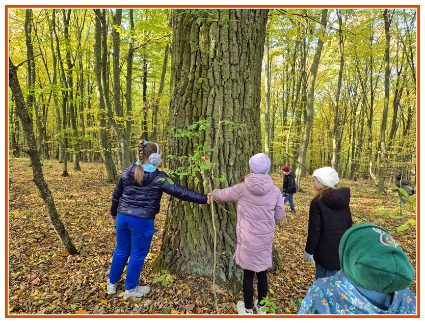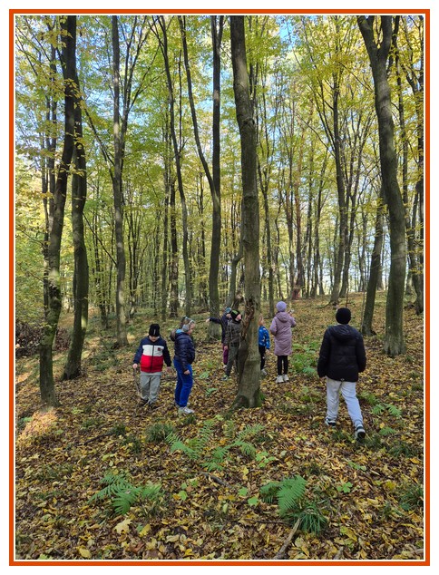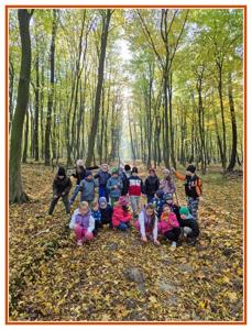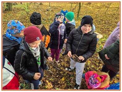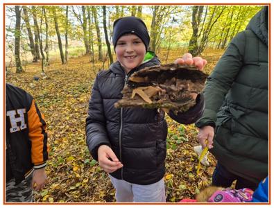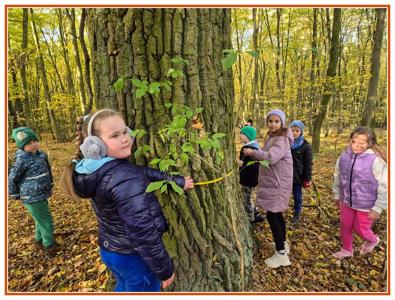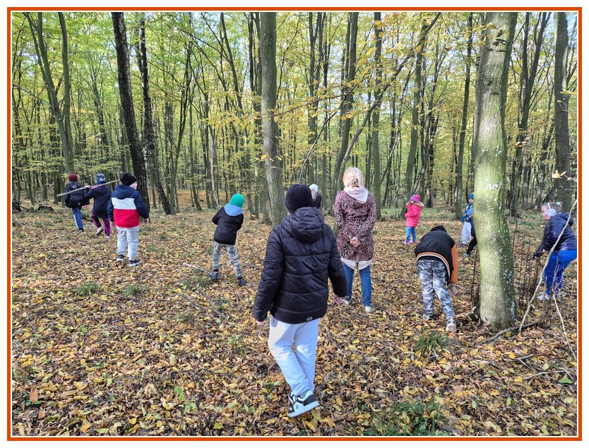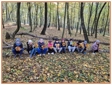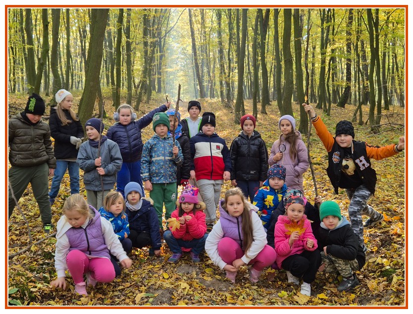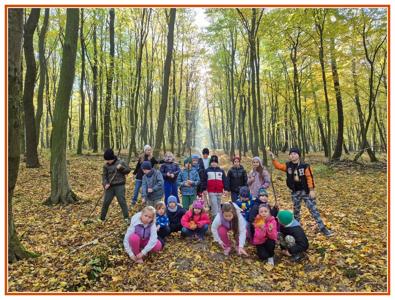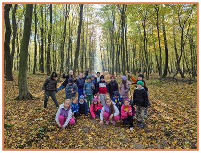 Podczas wędrówki dzieci przypomniały sobie, jak wyglądają poszczególne warstwy lasu, oraz z zaangażowaniem szukały oznak jesieni. Wspólnie odnaleźliśmy wiele gatunków grzybów, a także rozpoznawaliśmy, z jakich drzew spadły kolorowe liście. Nie zabrakło również zabawy – z leżących na ziemi gałęzi uczniowie wybudowali niewielki szałas, a następnie zmierzyli obwód potężnego dębu, który miał aż 367 cm!