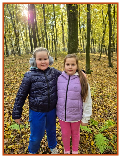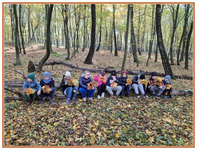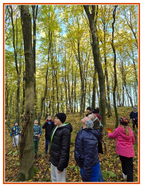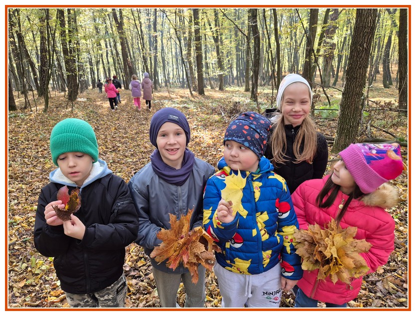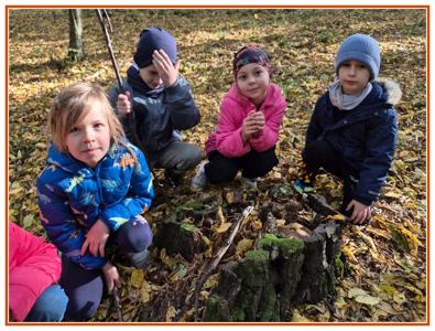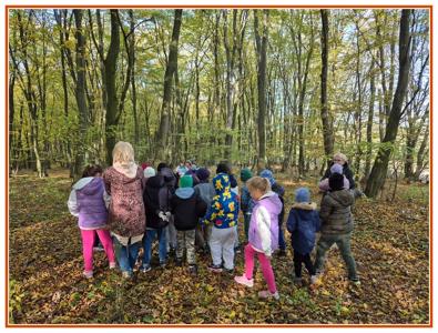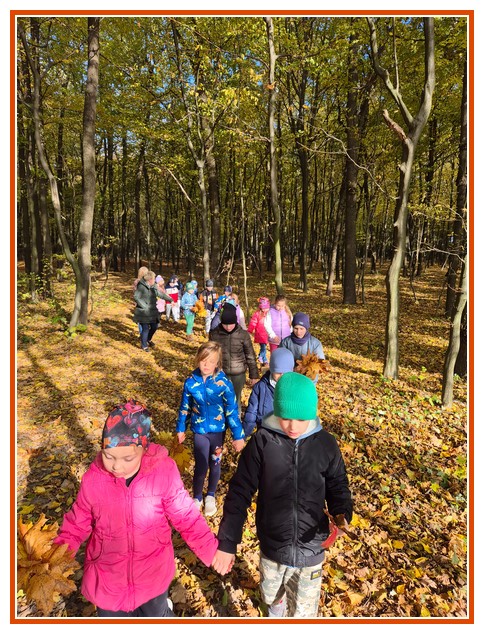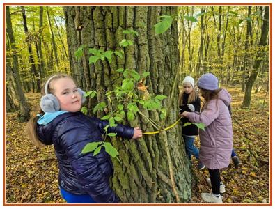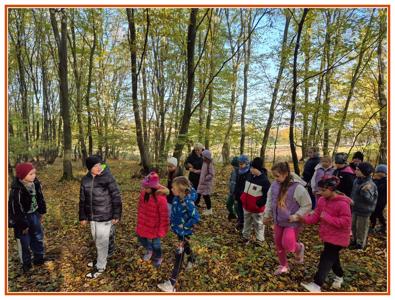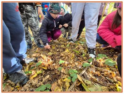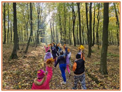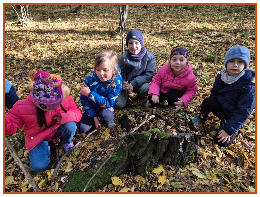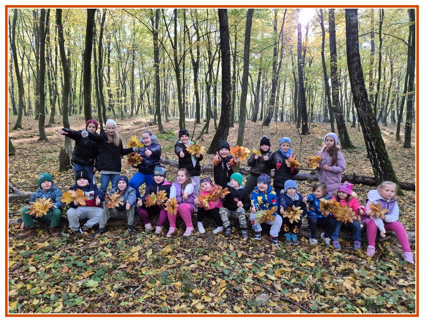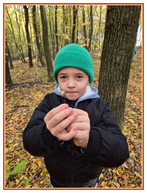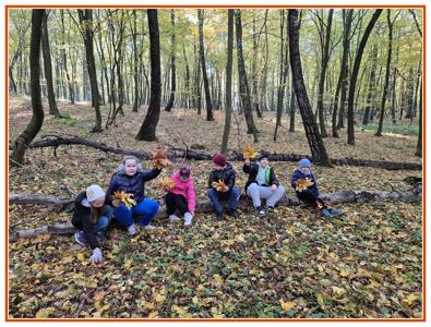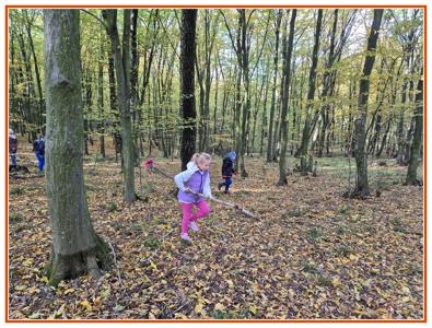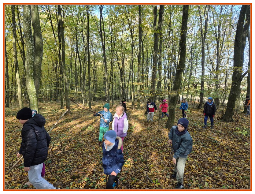 Podczas wędrówki dzieci przypomniały sobie, jak wyglądają poszczególne warstwy lasu, oraz z zaangażowaniem szukały oznak jesieni. Wspólnie odnaleźliśmy wiele gatunków grzybów, a także rozpoznawaliśmy, z jakich drzew spadły kolorowe liście. Nie zabrakło również zabawy – z leżących na ziemi gałęzi uczniowie wybudowali niewielki szałas, a następnie zmierzyli obwód potężnego dębu, który miał aż 367 cm!