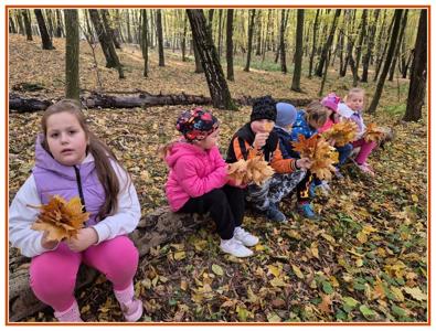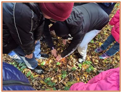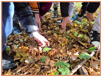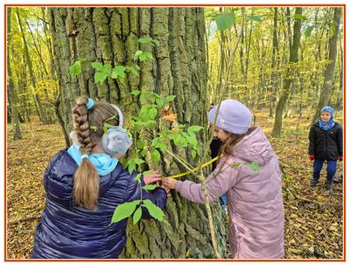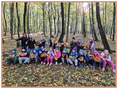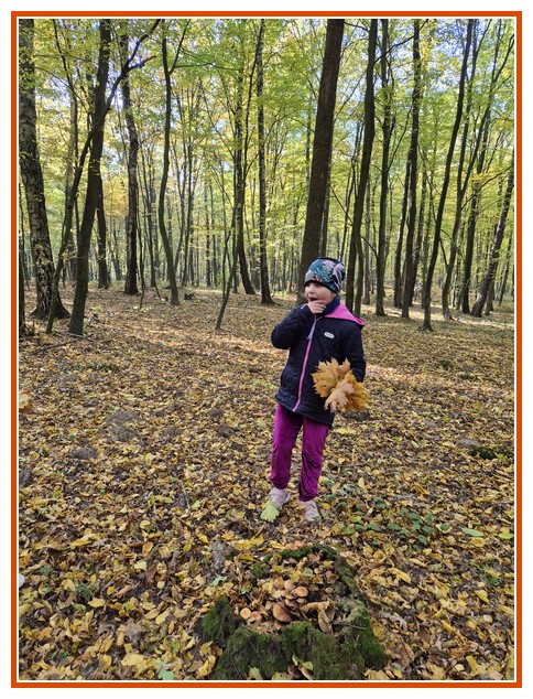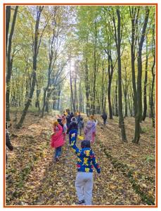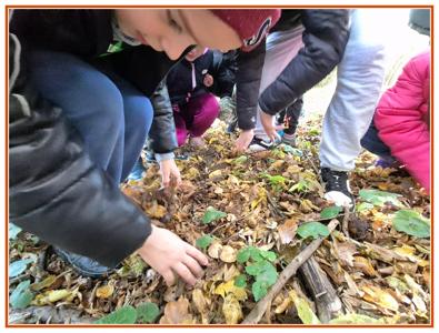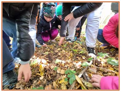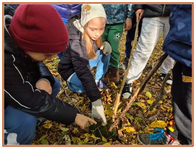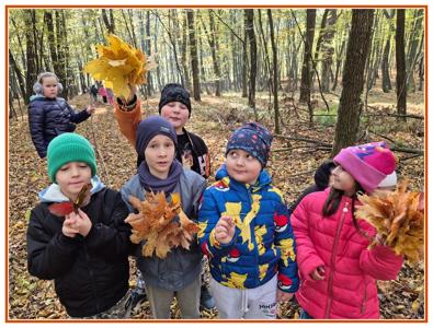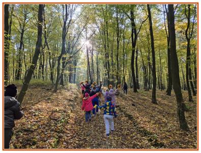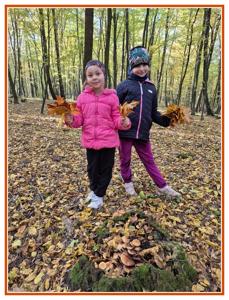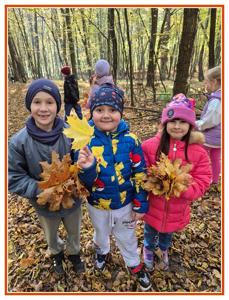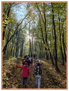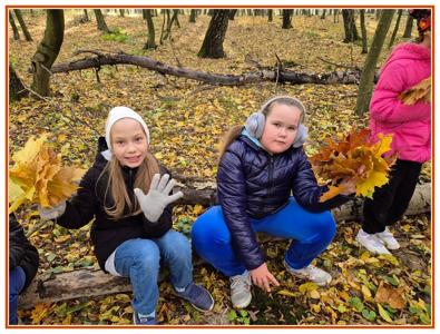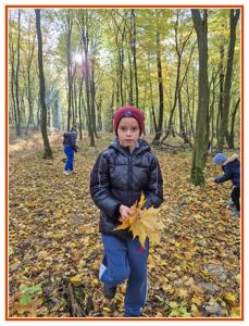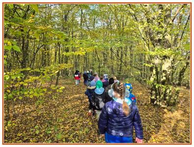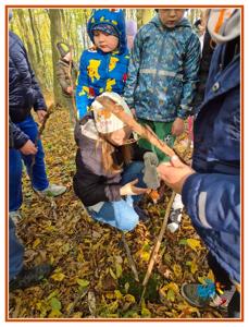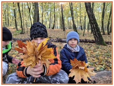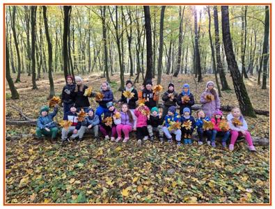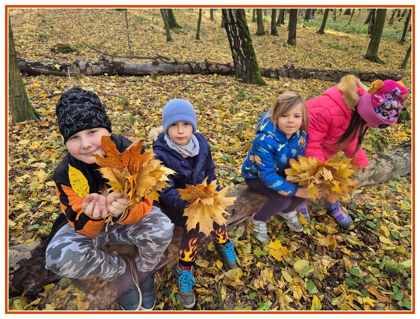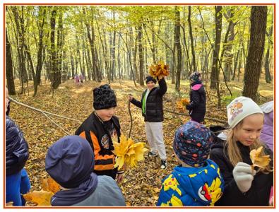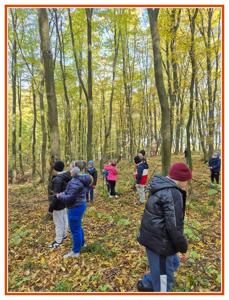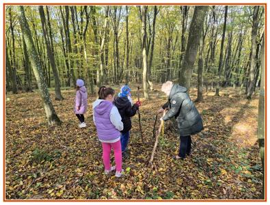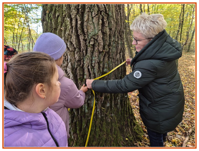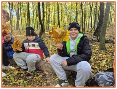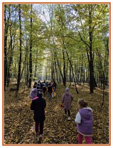 Podczas wędrówki dzieci przypomniały sobie, jak wyglądają poszczególne warstwy lasu, oraz z zaangażowaniem szukały oznak jesieni. Wspólnie odnaleźliśmy wiele gatunków grzybów, a także rozpoznawaliśmy, z jakich drzew spadły kolorowe liście. Nie zabrakło również zabawy – z leżących na ziemi gałęzi uczniowie wybudowali niewielki szałas, a następnie zmierzyli obwód potężnego dębu, który miał aż 367 cm!