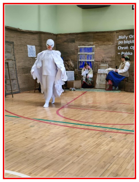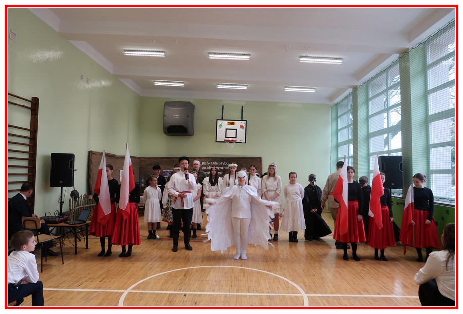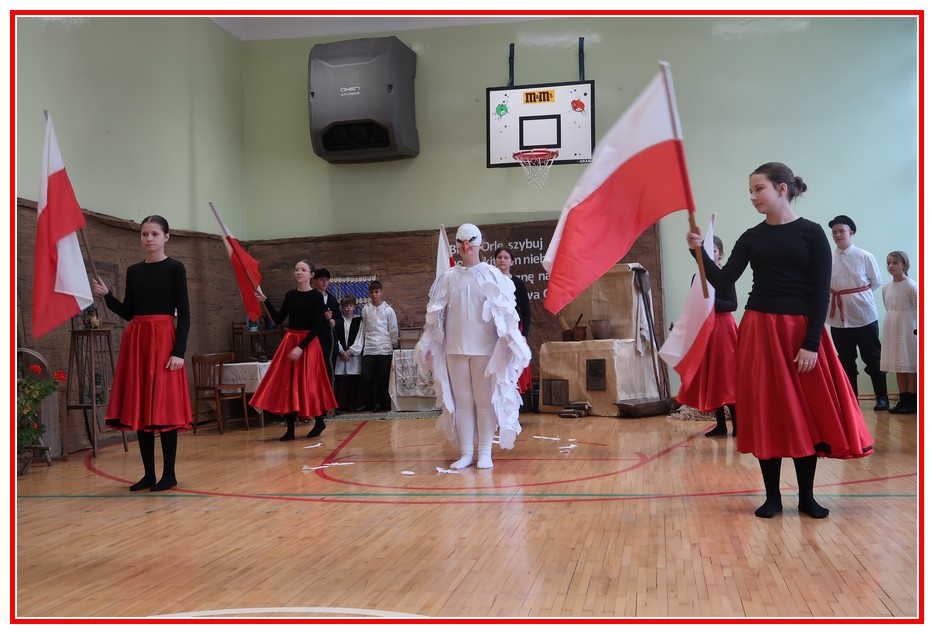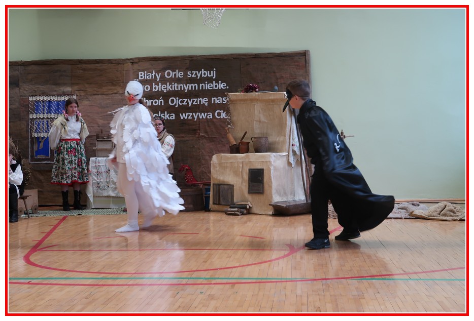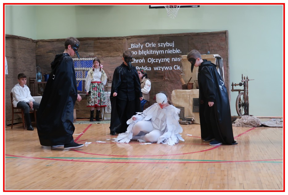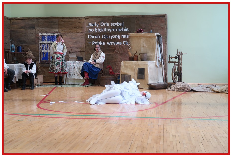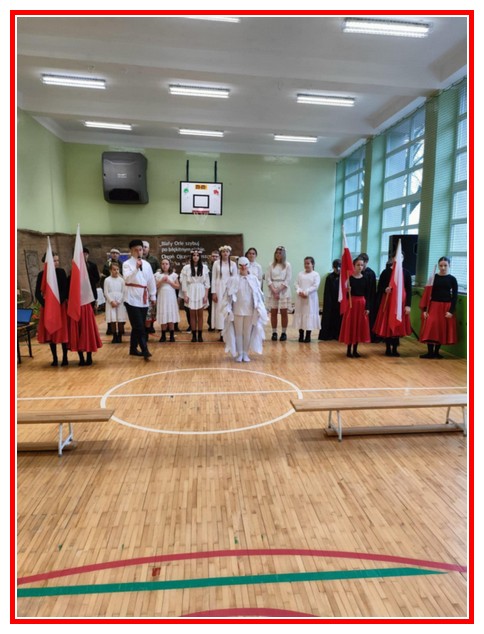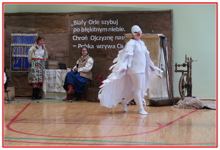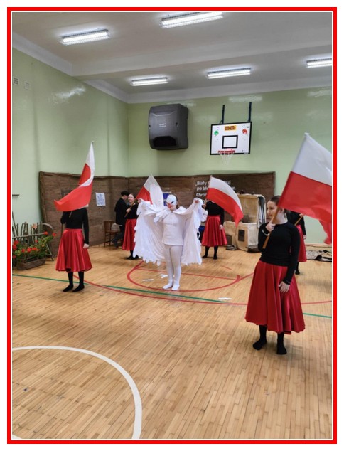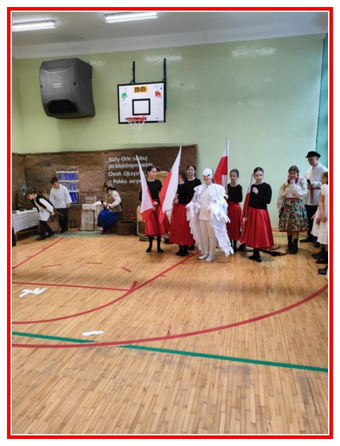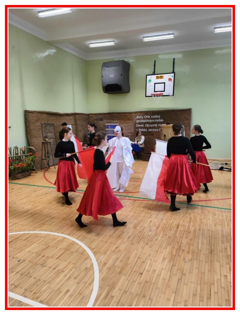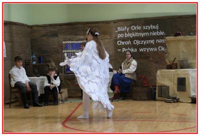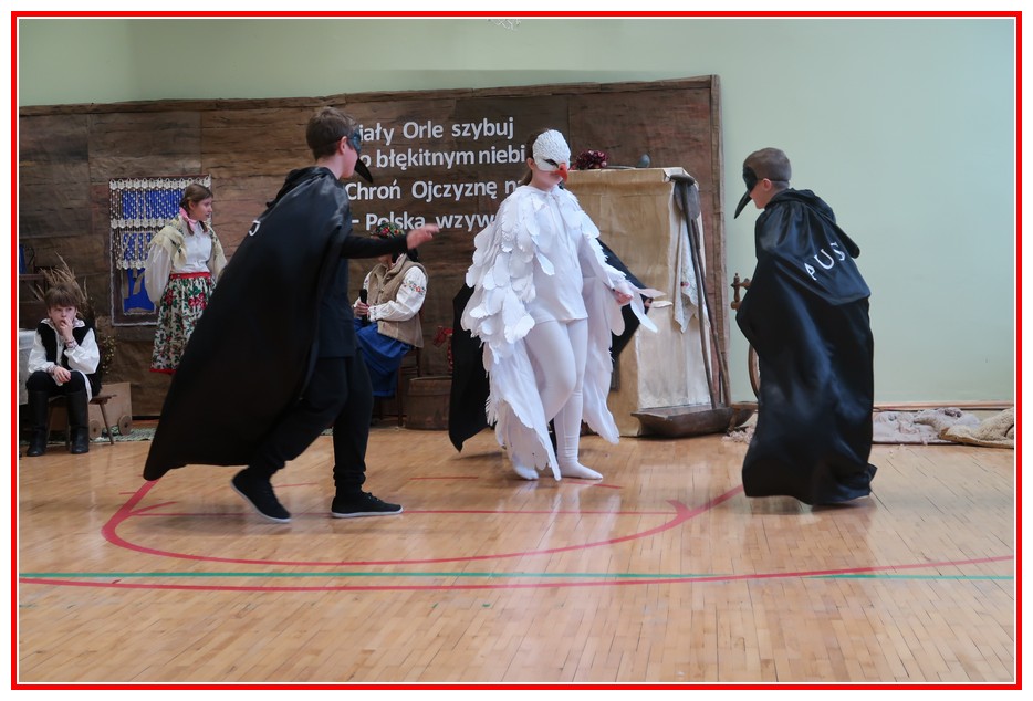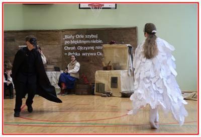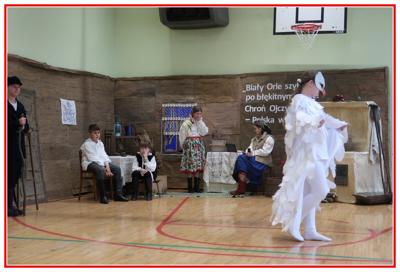 Z okazji rocznicy odzyskania Niepodległości przez Polskę, uczniowie zaprezentowali spektakl teatralny pt.”Pisk białego Orła”. Fabuła przedstawienia osnuta została wokół losów wiejskiej rodziny, która w czasie I wojny światowej przeżyła wojenną traumę – wymarsz ojca i jednego z synów na front. Ludzie ci ukrywali w swoim domu poetę, który odwołując się do literatury i poezji okresu zaborów, podtrzymywał i umacniał głęboki patriotyzm domowników. W wielu sytuacjach odwoływał się do tragicznej historii naszego państwa. Symbolem wolnej Polski staje się biały orzeł, którego pisk, słyszalny w duszy Polaków, nie pozwalał tracić nadziei na wolność. Jednak oprócz prawdziwych patriotów byli i tacy, którym było obojętne, czy Polska jest wolna, czy nie, „byle był spokój i miska pełna”. Taką postawę reprezentowały koty. Spektakl został urozmaicony pantomimą ukazującą Legendę o Białym Orle. Była to w nietypowy sposób opowiedziana historia utraty i odzyskania niepodległości przez naszą Ojczyznę. Sam moment zmartwychwstania Polski został przedstawiony w formie układu tanecznego z flagami. Przedstawienie odbywało się przy nastrojowych, dobranych do tematyki patriotycznej piosenkach, wykonanych przez szkolny zespół wokalny. Myślą przewodnią całości były słowa z pieśni Szybuj Orle: „Biały Orle szybuj po błękitnym niebie . Chroń Ojczyznę naszą- Polska wzywa Ciebie”