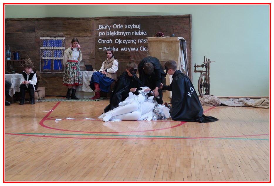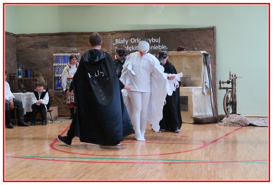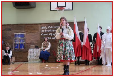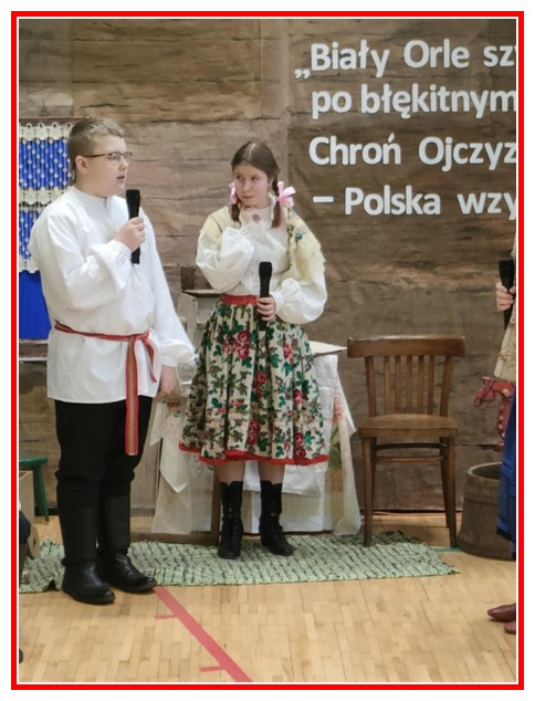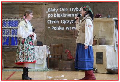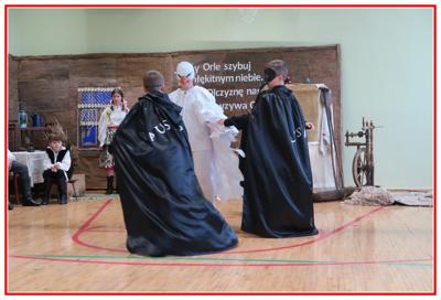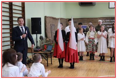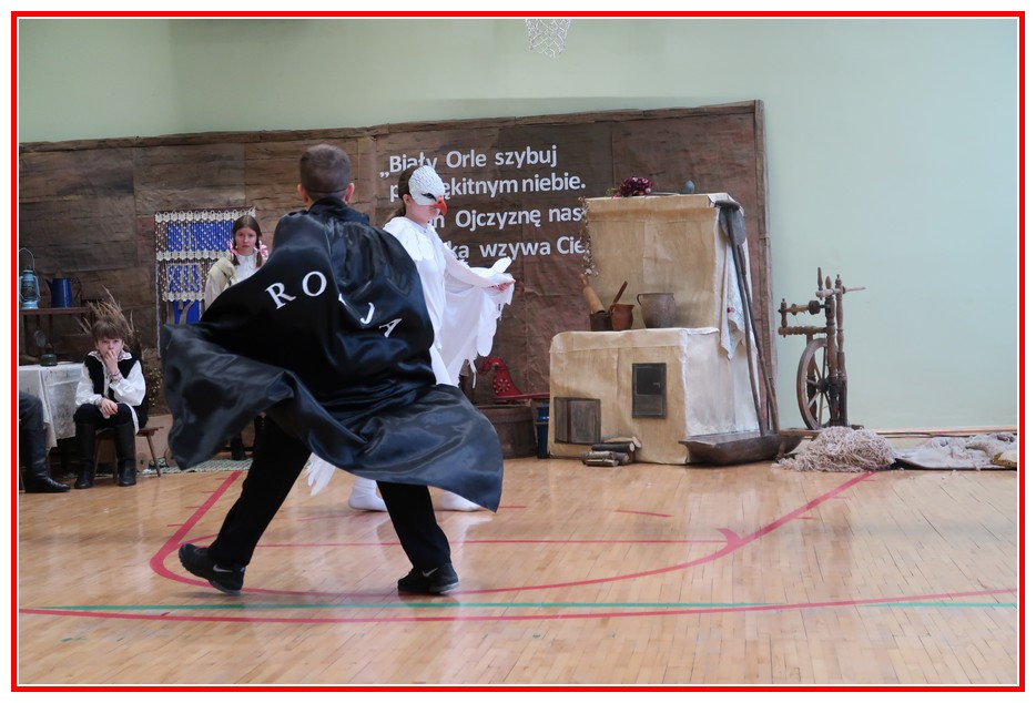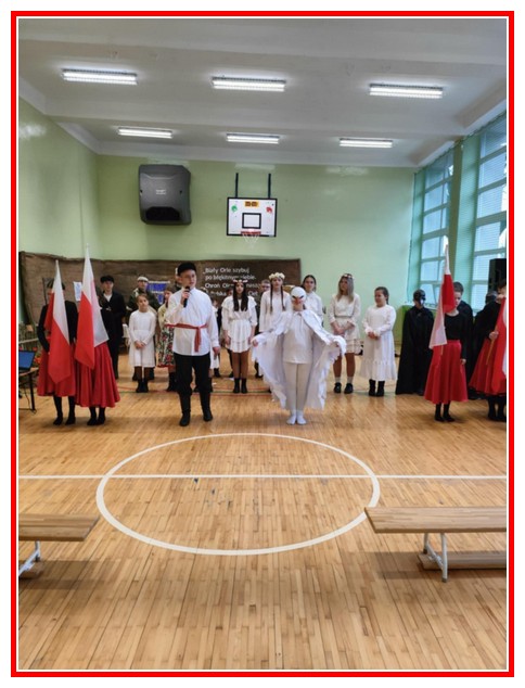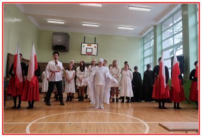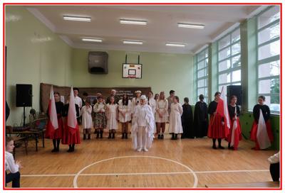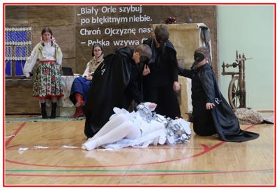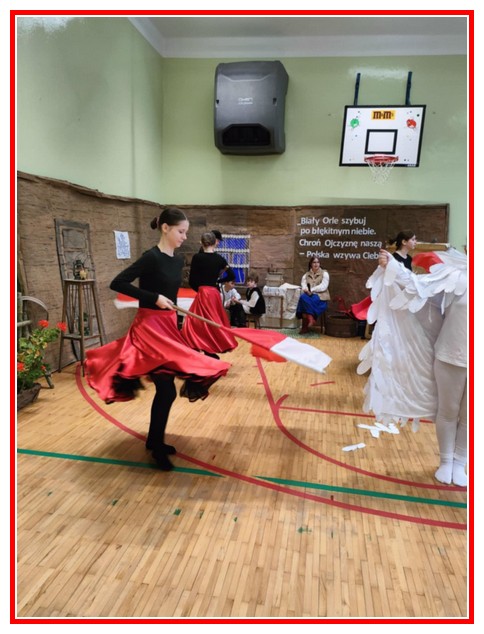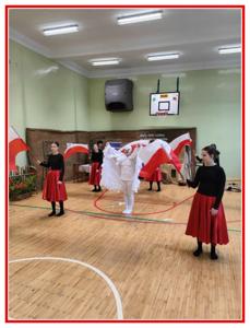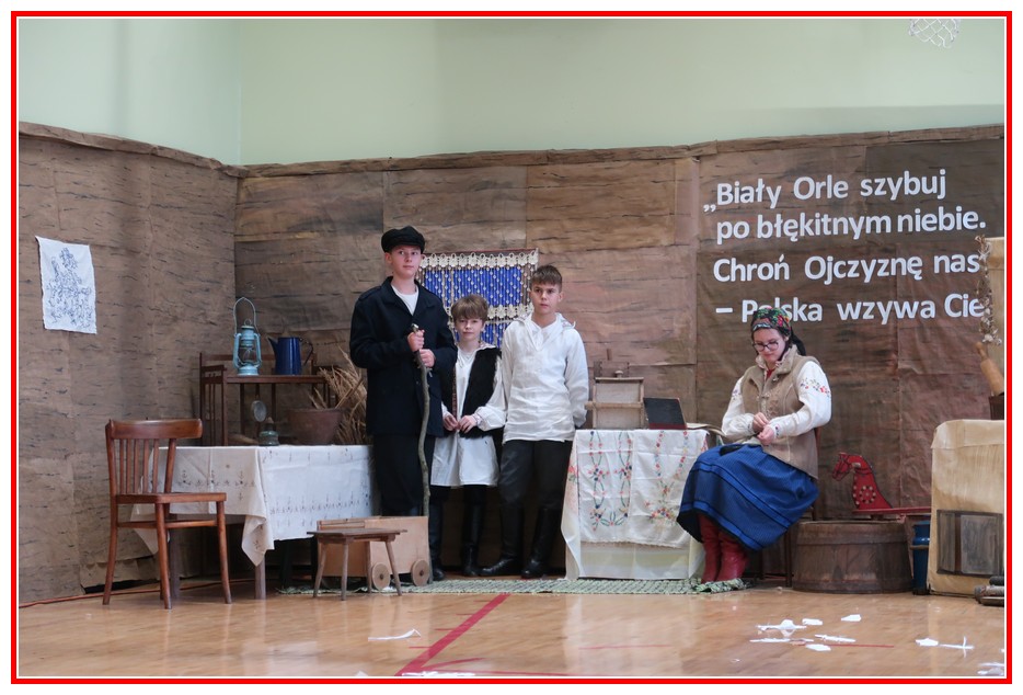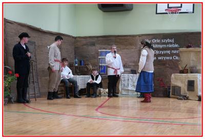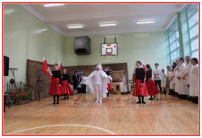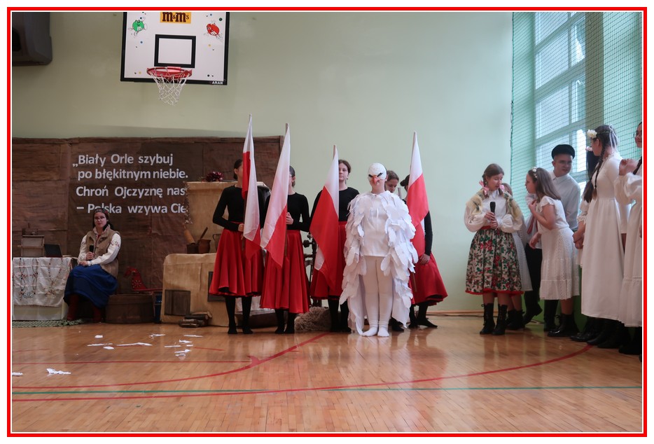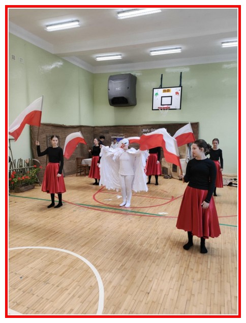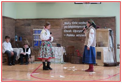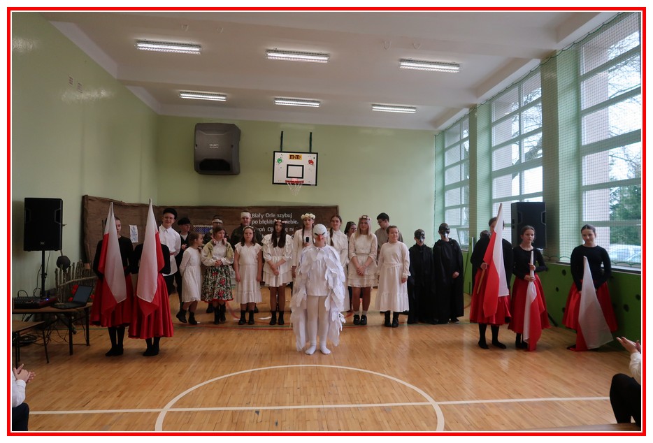 Z okazji rocznicy odzyskania Niepodległości przez Polskę, uczniowie zaprezentowali spektakl teatralny pt.”Pisk białego Orła”. Fabuła przedstawienia osnuta została wokół losów wiejskiej rodziny, która w czasie I wojny światowej przeżyła wojenną traumę – wymarsz ojca i jednego z synów na front. Ludzie ci ukrywali w swoim domu poetę, który odwołując się do literatury i poezji okresu zaborów, podtrzymywał i umacniał głęboki patriotyzm domowników. W wielu sytuacjach odwoływał się do tragicznej historii naszego państwa. Symbolem wolnej Polski staje się biały orzeł, którego pisk, słyszalny w duszy Polaków, nie pozwalał tracić nadziei na wolność. Jednak oprócz prawdziwych patriotów byli i tacy, którym było obojętne, czy Polska jest wolna, czy nie, „byle był spokój i miska pełna”. Taką postawę reprezentowały koty. Spektakl został urozmaicony pantomimą ukazującą Legendę o Białym Orle. Była to w nietypowy sposób opowiedziana historia utraty i odzyskania niepodległości przez naszą Ojczyznę. Sam moment zmartwychwstania Polski został przedstawiony w formie układu tanecznego z flagami. Przedstawienie odbywało się przy nastrojowych, dobranych do tematyki patriotycznej piosenkach, wykonanych przez szkolny zespół wokalny. Myślą przewodnią całości były słowa z pieśni Szybuj Orle: „Biały Orle szybuj po błękitnym niebie . Chroń Ojczyznę naszą- Polska wzywa Ciebie”